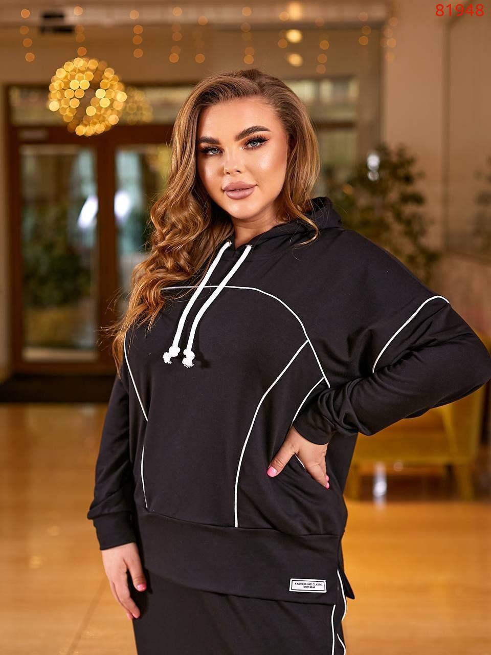 Кофта вільного крою декорована кантом, кишені. Спідниця прямого крою, пояс гумка