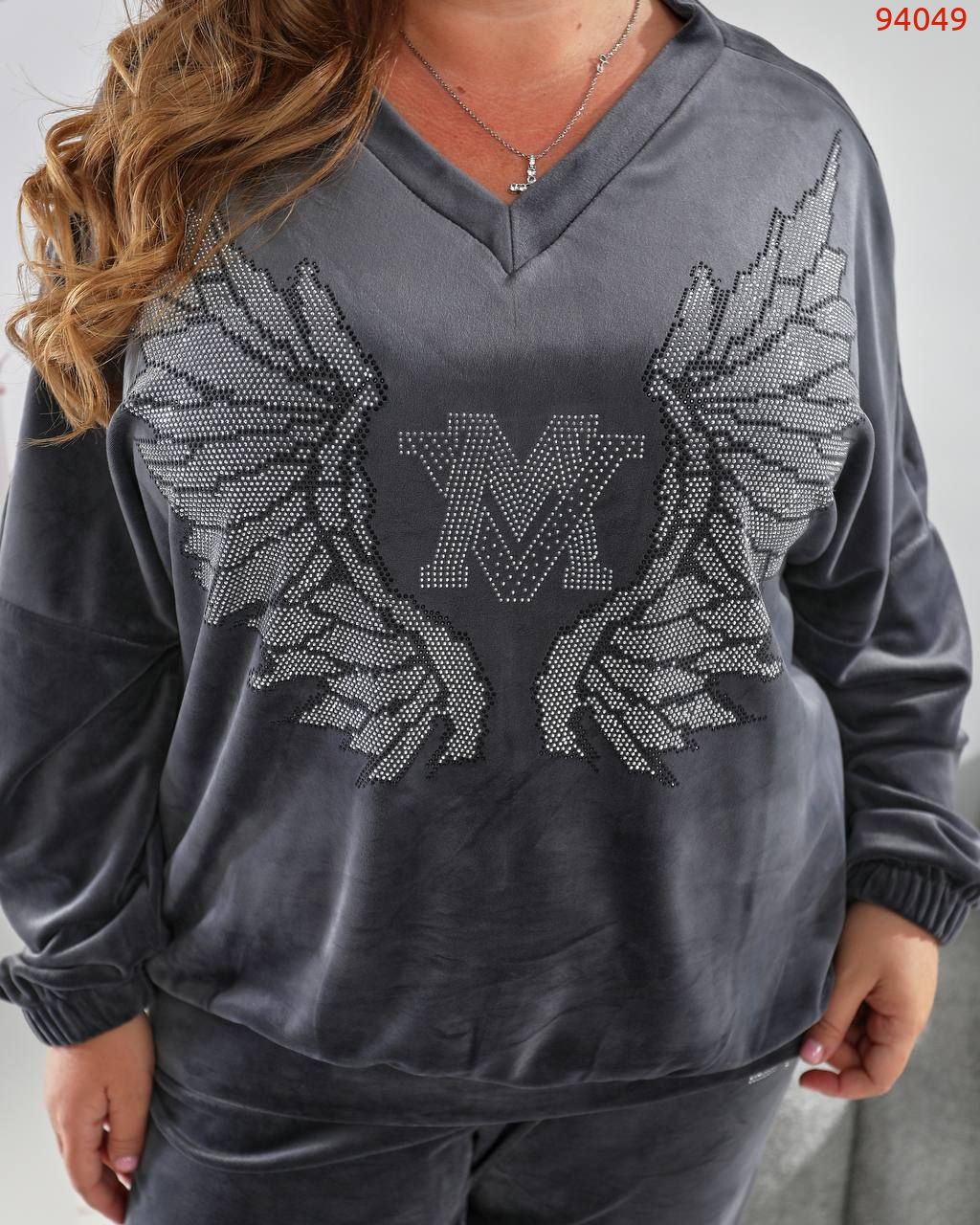 Модель складається з вільного світшота з V-подібним вирізом, а також зручних штанів на манжетах.