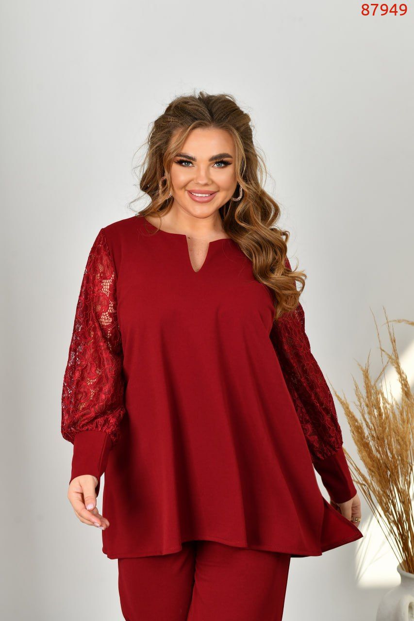 Туніка А-подібного силуету, завдяки чому чудово приховує будь-які недоліки фігури та підкреслює переваги. Горловина оригінальної форми. Рукави із гарного гіпюру в тон основної тканини, на манжетах. З боків невеликі розрізи. Застібок, кишень немає.