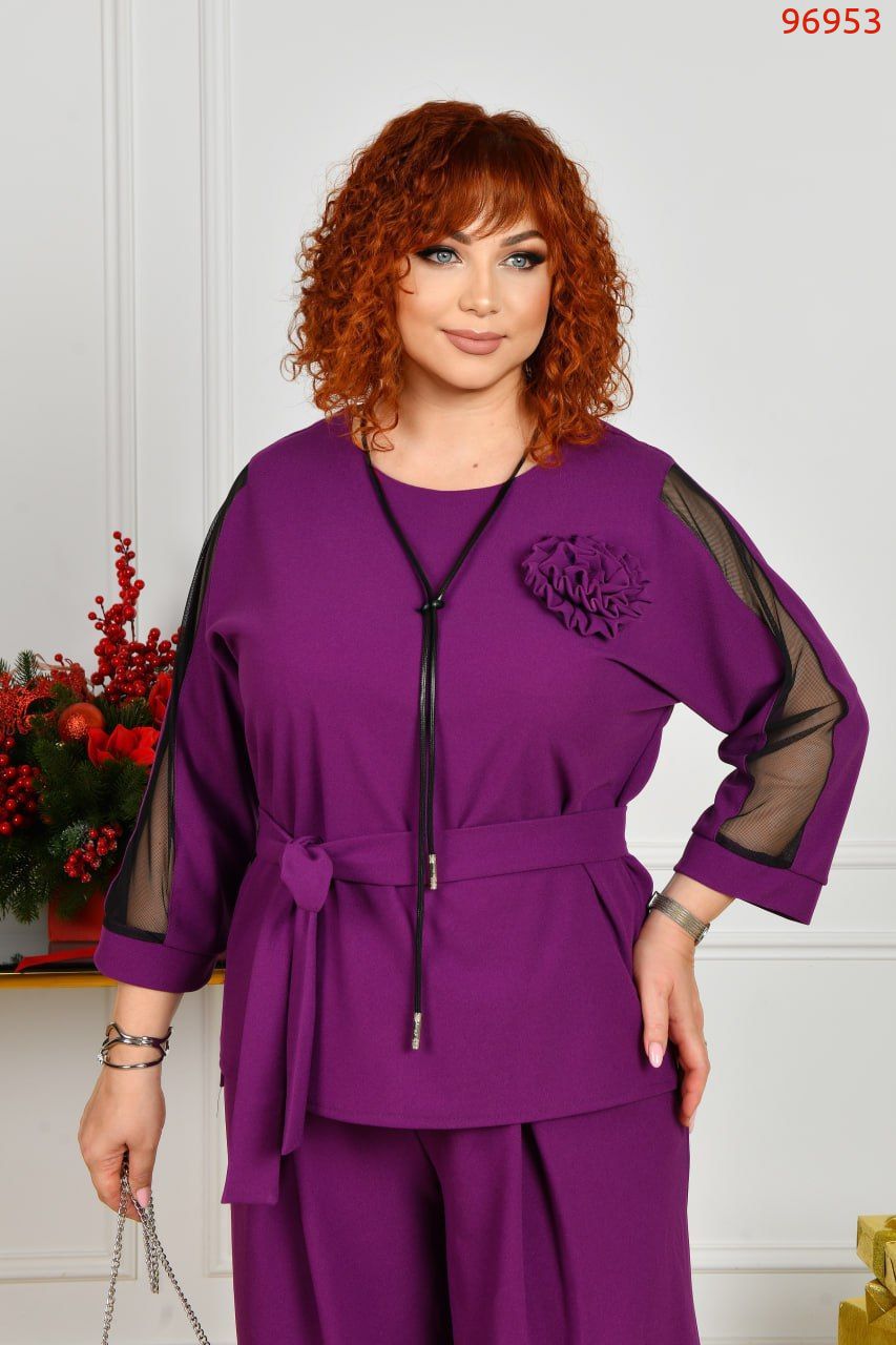 Туніка вільного силуету із цільнокроєним рукавом, довжиною 7/8. Виріз горловини круглий. Низ асиметричний, з боків невеликі розрізи. Туніку декоровано текстильною квіткою в тон, а також вставками із мʼякої сіточки. Талію можна підкреслити поясом із основної тканини.