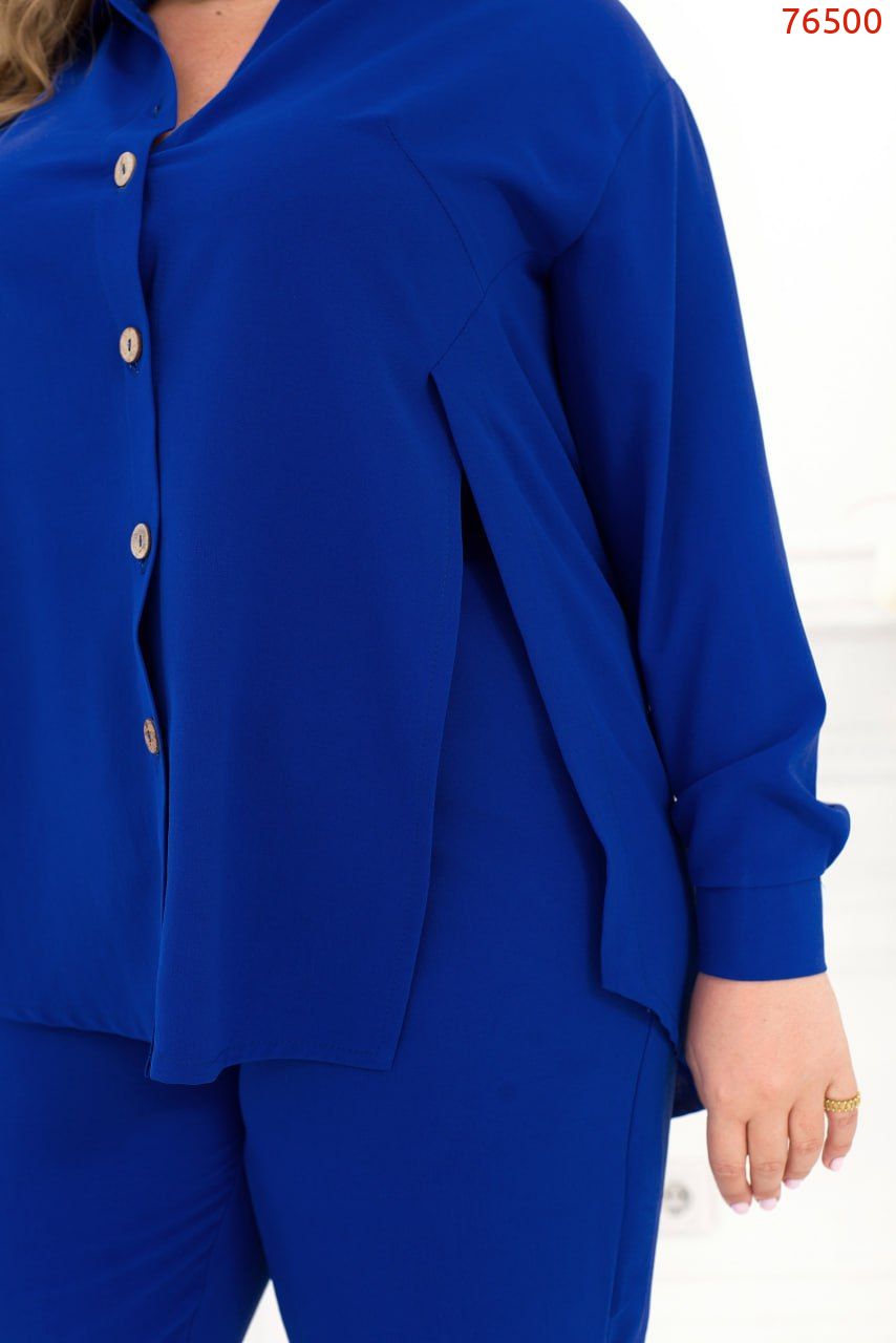 Стильний монохромний костюм, що виконаний з легкої жатой тканини, добре сідає по фігурі, незалежно від її особливостей. У комплект входять лаконічні штани на резинці з кишенями і виразна блуза в тон, що доповнена відкладним коміром, довгими рукавами з манжетами і функціональними гудзиками спереду на планці. Родзинкою цієї блузи є розрізи з боків спереду, що розпахуються і роблять її ще більш повітряної і невагомою.