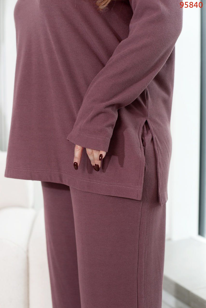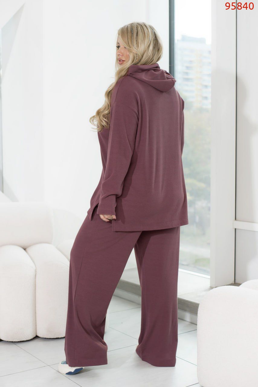 Легкий костюм-двійка, виконаний з м’якої та теплої тканини, відмінно поєднується з кросівками і великими джинсовими куртками. До його складу входить кофта крою oversize зі светром з довгими рукавами і капюшоном, а також актуальні штани-палаццо вільного крою з кишенями на резинці, вшитій по лінії талії.