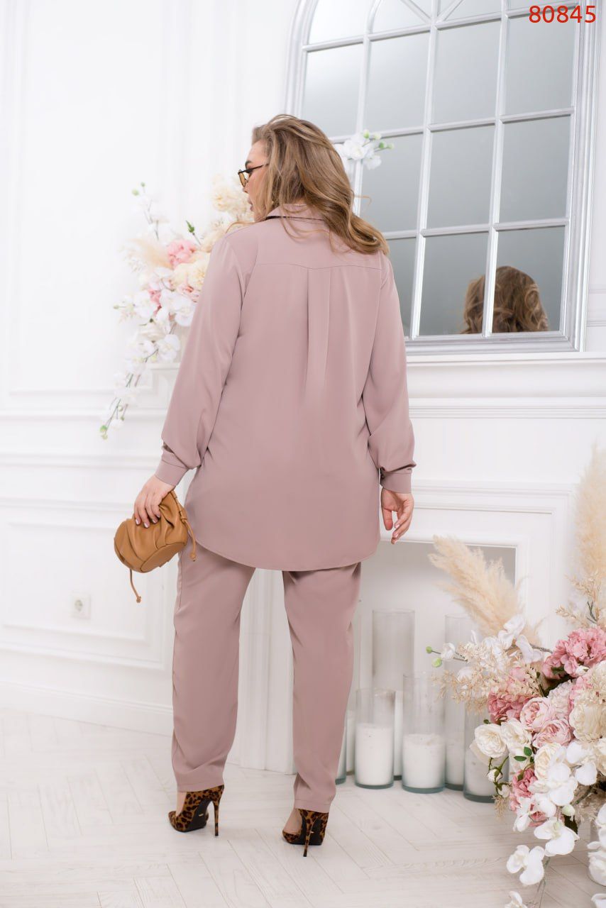 Наша новинка – легкий і стильний костюм-двійка, виготовлений із тканини полегшенної костюмки Армані. Сорочка має подовжений крій і відкладний комір, застібається на ґудзиках і доповнена накладною кишенею для додаткового зручності. Рукава довгі доповнені манжетом, який застібається на ґудзик. Брюки вільного крою з високою талією, надаючи їм винятковий комфорт. В пояс вшита резинка, а внутрішні кишені по боках завершують стильні та функціональні брюки. Цей костюм можна носити як самостійний комплект або доповнити його топом контрастного кольору та аксесуарами для створення неповторного образу.