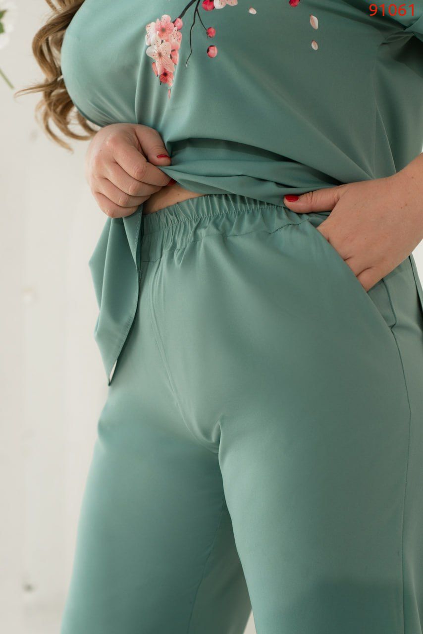 Наша нова модель костюму з укороченими брюками не залишить тебе байдужою. Ніжний принт на блузці робить цей образ неперевешеним. Цільнокрений рукав з манжетами-відворотами та бічні розрізи додають легкості виробу. Укорочені брюки вільного крою з манжетами мають гумку на талії. По бокам є зручні кишеньки для найважливіших речей.