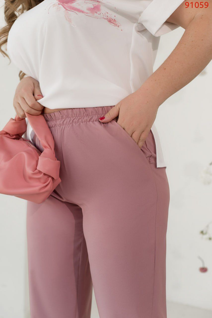 Неймовірний легкий костюм-двійка з брюками прямого крою доповнить твій літній гардероб. Біла блуза вільного крою має яскравий візерунок. Напівкругла горловина та цільнокроєний рукав з манжетами-відворотами створені для комфорту. Лаконічні брюки з гумкою на талії з високою посадкою допоможуть відчувати себе впевнено. А також вони мають кишеньки по боках.