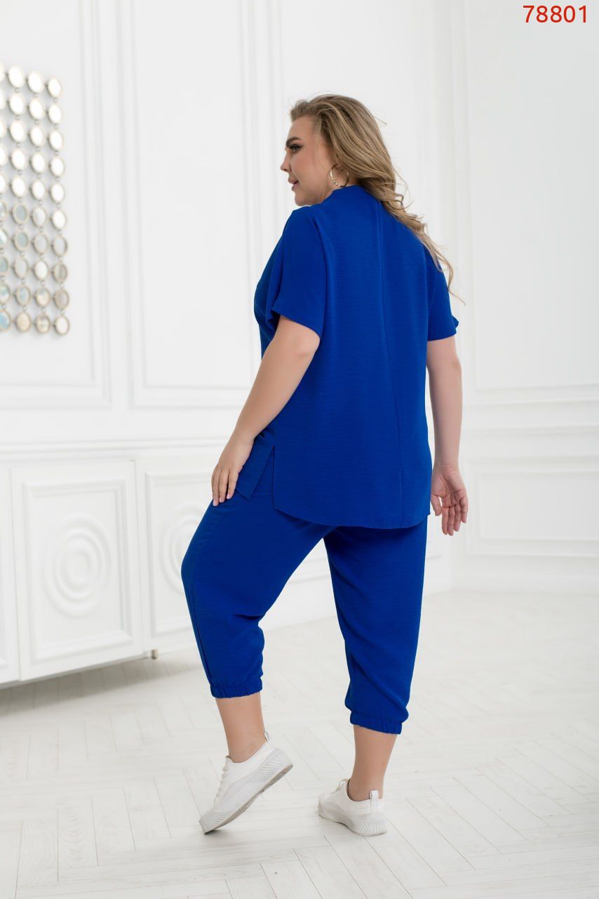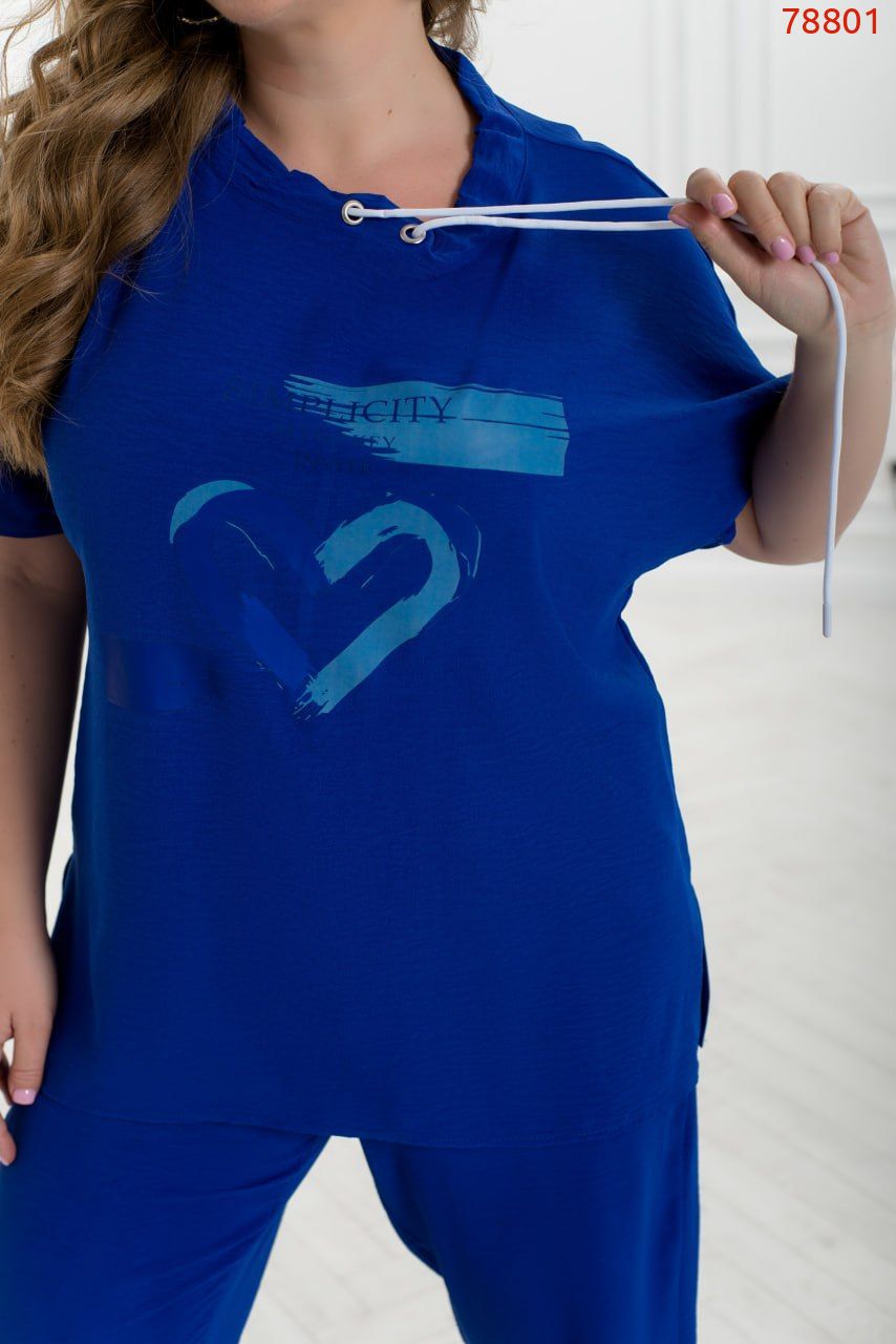 Легкий контрастний костюм в стилі casual з подовженою футболкою і брюками-капрі, який зробить кожен день спекотного літа - комфортним. Невагома футболка з рухомим декоративним шнурком в напівкруглому вирізі горловини. Має суцільнокроєний короткий рукав. На основі розмішено яскраву декоративну наліпку. Зручним доповненням є укорочені штани-капрі з гумками на талії та у вигляді манжетів. Для комфорту ми додали бічні кишені для дрібничок.