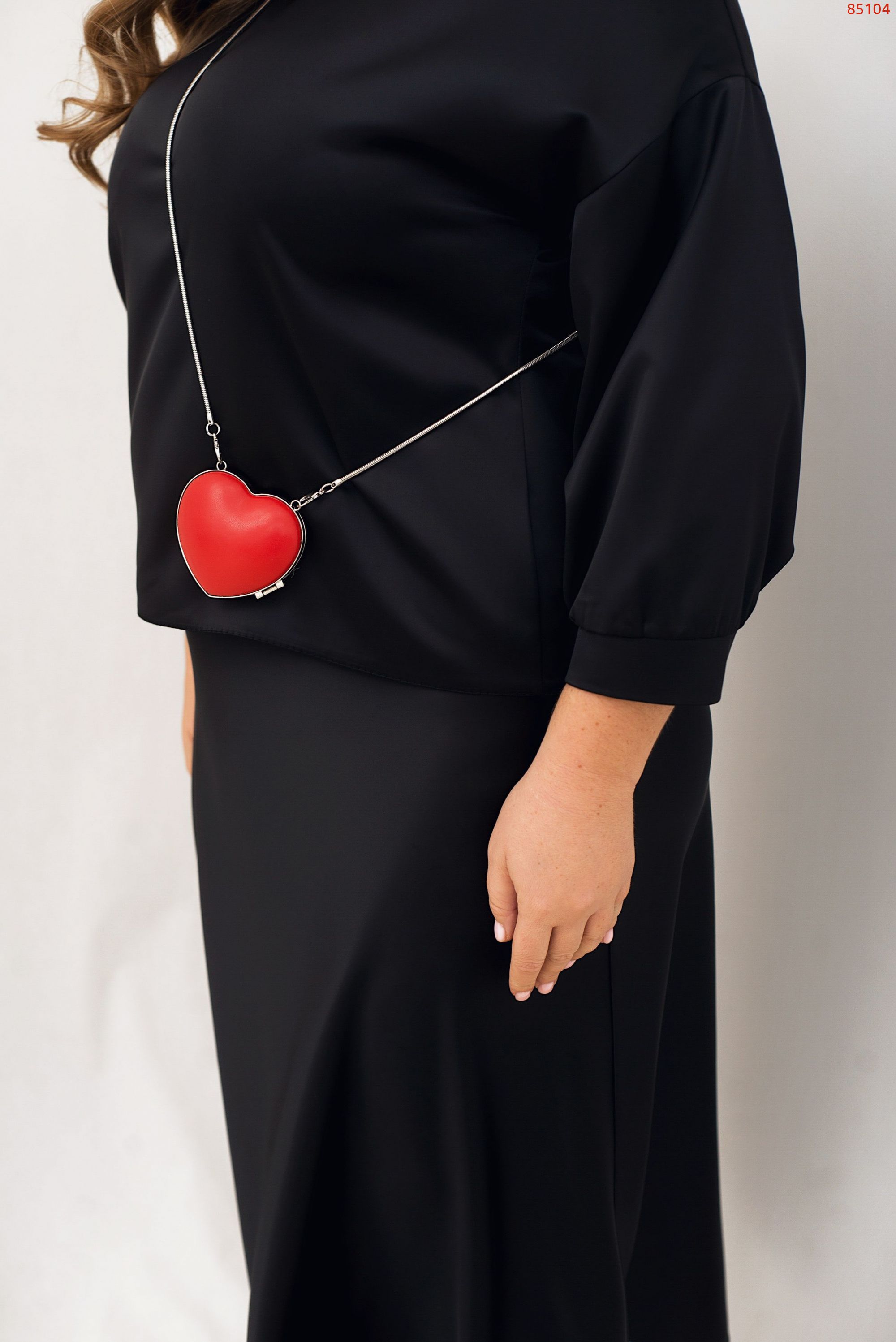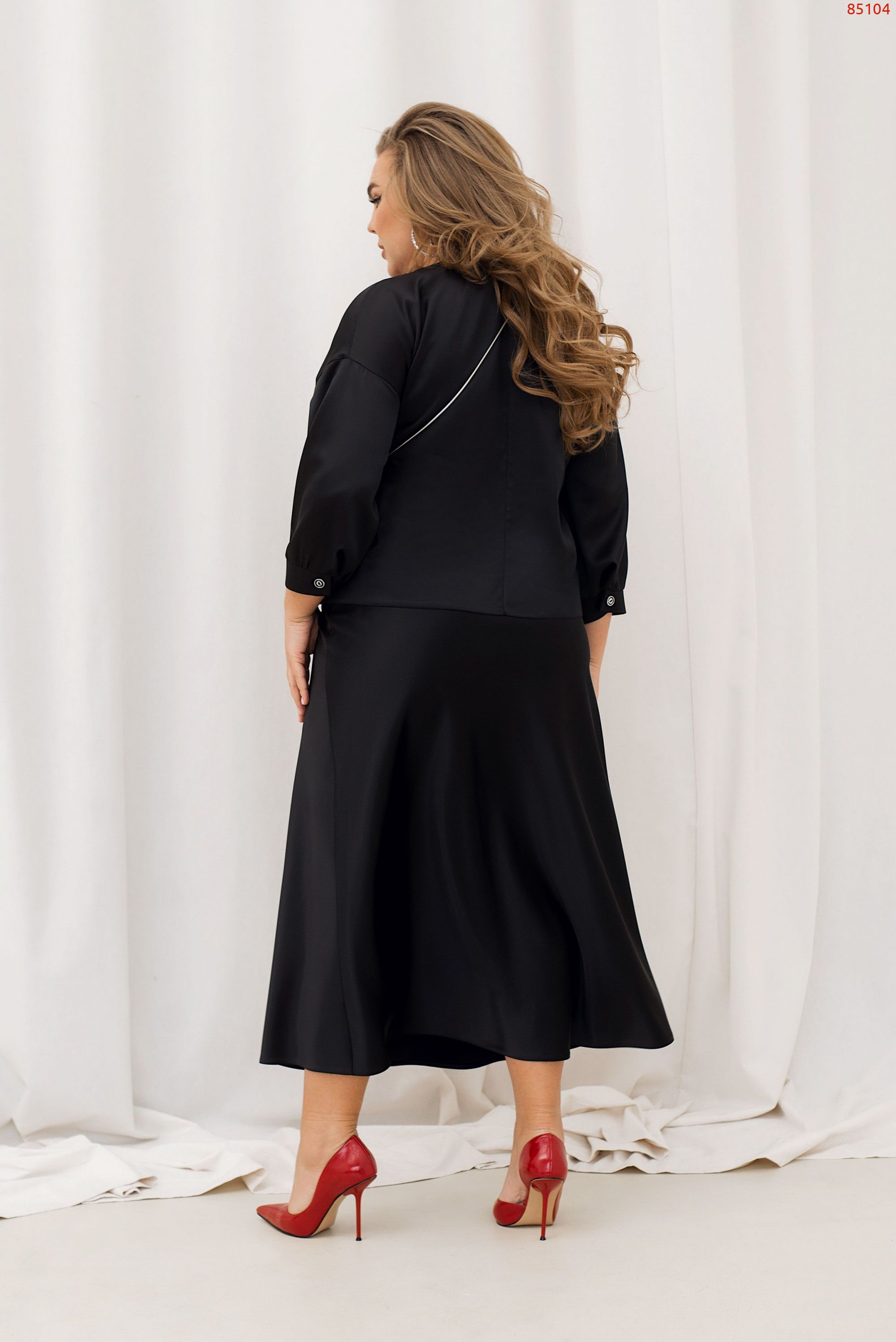 Елегантний святковий костюм зі спідницею, створений із розкішного костюмного шовку, стане вашим ідеальним образом для новорічних свят. Він поєднує витонченість і комфорт, роблячи вас зіркою будь-якої святкової події. Блуза з V-подібним вирізом створює акцент на зоні декольте, додаючи образу жіночності. Спущена лінія плечей та рукави довжиною 3/4 з манжетами на ґудзиках забезпечують стильний вигляд і зручність. Довга спідниця на резинці комфортно сідає по фігурі, а текстильний пояс, що входить до комплекту, дозволяє підкреслити талію та додає завершеності образу. Цей костюм створений, щоб ви відчували себе впевнено й виглядали розкішно під час зустрічі Нового року чи будь-якого іншого особливого заходу.