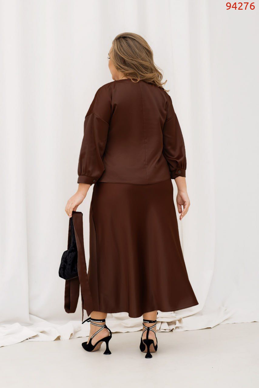 Елегантний святковий костюм зі спідницею, створений із розкішного костюмного шовку, стане вашим ідеальним образом для новорічних свят. Він поєднує витонченість і комфорт, роблячи вас зіркою будь-якої святкової події. Блуза з V-подібним вирізом створює акцент на зоні декольте, додаючи образу жіночності. Спущена лінія плечей та рукави довжиною 3/4 з манжетами на ґудзиках забезпечують стильний вигляд і зручність. Довга спідниця на резинці комфортно сідає по фігурі, а текстильний пояс, що входить до комплекту, дозволяє підкреслити талію та додає завершеності образу. Цей костюм створений, щоб ви відчували себе впевнено й виглядали розкішно під час зустрічі Нового року чи будь-якого іншого особливого заходу.