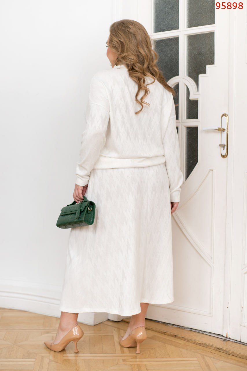 Елегантний костюм зі спідницею, виконаний із щільної, неймовірно якісної в'язаної тканини, яка не кашлатиться та зберігає бездоганний вигляд навіть після тривалого носіння. Кофта має лаконічну горловину та довгі рукави із заниженою лінією плеча, що додає модного акценту та забезпечує комфорт. По низу кофтинки проходить манжет, який завершує образ витонченими деталями. Спідниця костюма має вишуканий приталений силует, який чудово підкреслює фігуру, додаючи жіночності. Резинка на поясі забезпечує комфортну посадку та свободу рухів. Позаду спідниці йде шов, що надає моделі додаткової елегантності та стильності. Цей костюм – гармонійне поєднання стилю, якості та зручності, яке підкреслить ваш смак та елегантність.