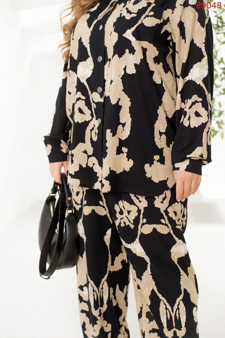 Легкий костюм із сорочки та брюк зі штапелю – ідеальний вибір для комфортних і стильних образів. Вільна сорочка з класичним коміром застібається на ґудзики, а довгі рукави з манжетами додають елегантності. Акуратна кишенька на грудях виступає стильним акцентом. Брюки з високою талією на резинці забезпечують комфортну посадку, а бічні кишені додають практичності. Завдяки своїй легкості та приємній текстурі тканина дарує комфорт. Цей костюм ідеально підійде для прогулянок, зустрічей або подорожей, дозволяючи почуватися невимушено та виглядати бездоганно.
