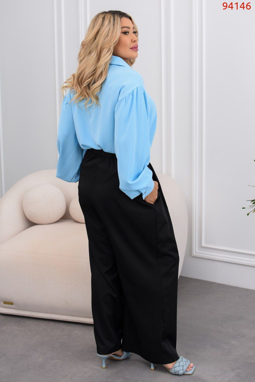Костюм – універсальний комплект для роботи, прогулянок і особливих моментів. Вільна сорочка додає легкості, а кюлоти з еластичною талією позаду дарують комфорт та свободу рухів.