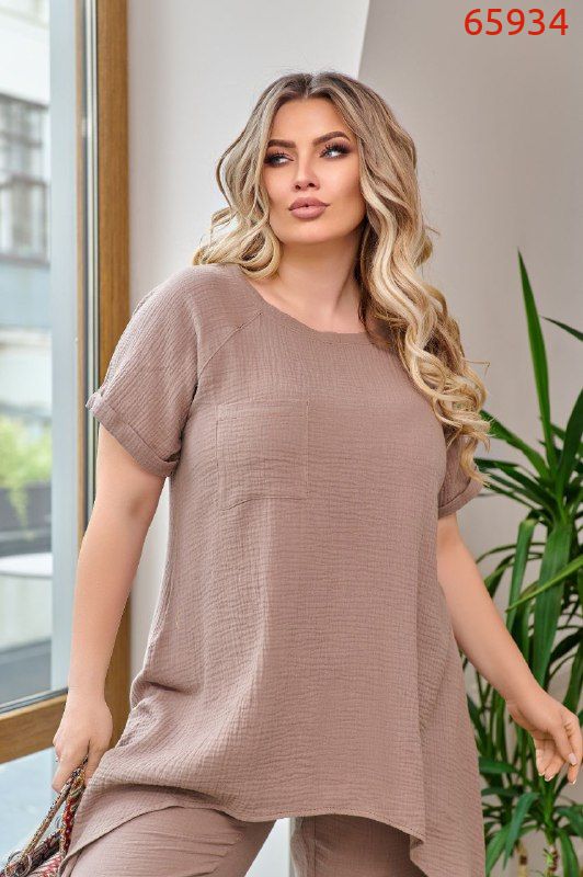 Додаткові характеристики: Сезон літо. Тканина з натуральних волокон - тому не буде парити в жарку погоду. Стильний та якісний костюм для будь якого випадку. Туніка вільного покрою, з асиметрією. Штани з кишенями, від стегон ідуть вільні, до низу завужені. посадка висока, зручний шов сидіння, пояс на резинці - простроченний на спеціальному обладнанні для хорошої фіксаціі резинки - не буде перекручуватися.