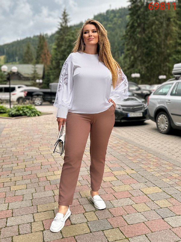 Брюки напівоблягаючі, до низу звужені.Посадка висока, зручний шов сидіння, пояс спереді рівний, сзаду на резинці- простроченний на спеціальному обладнанні для хорошої фіксаціі резинки- не буде перекручуватися, з кишенями.