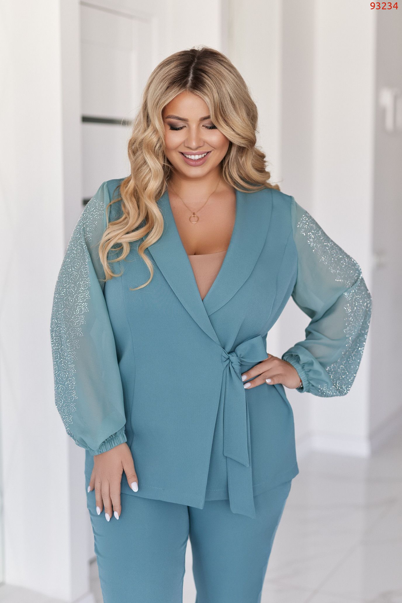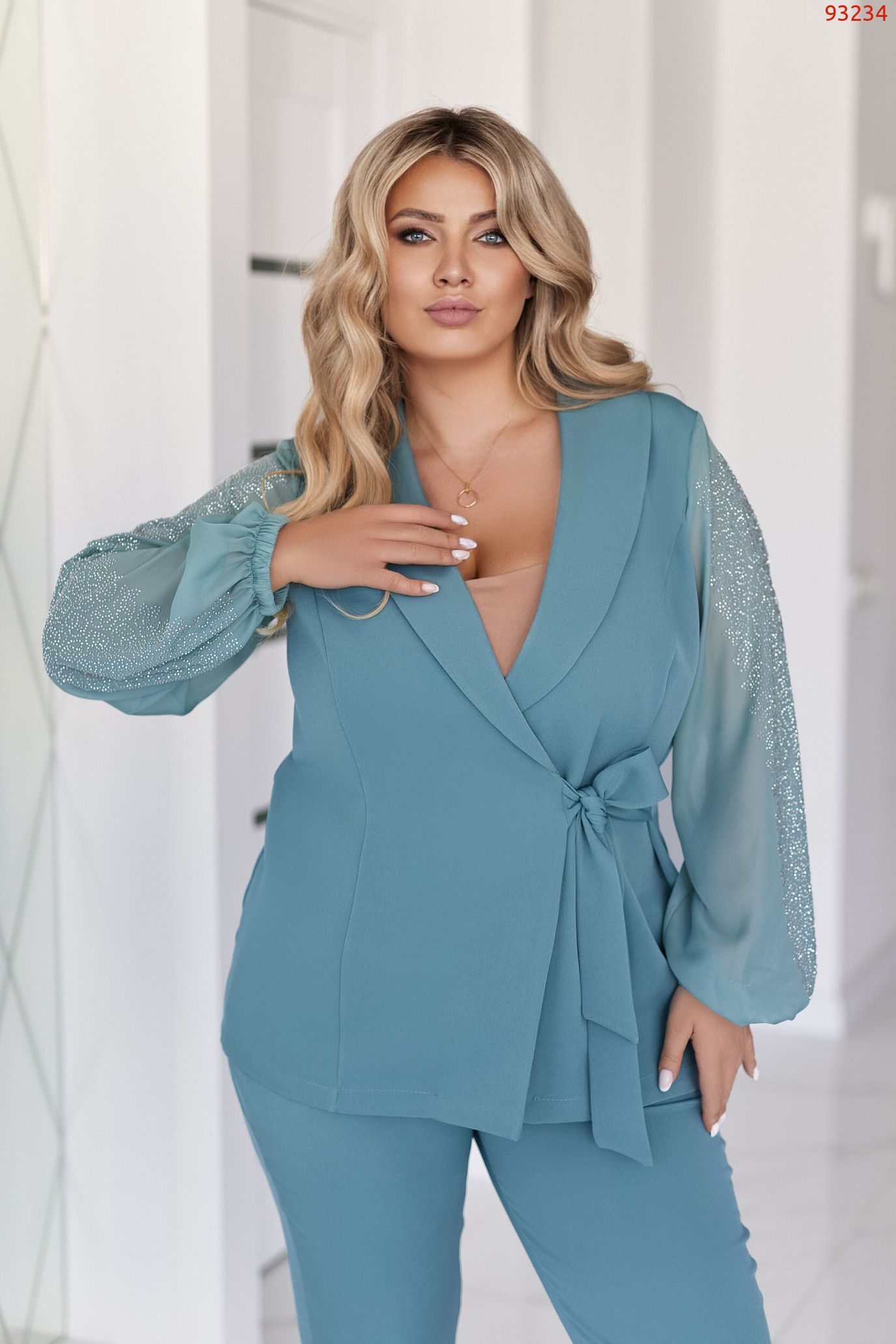▪︎ Елегантний костюм з костюмки діагональ у поєднанні з легкими шифоновими рукавами.