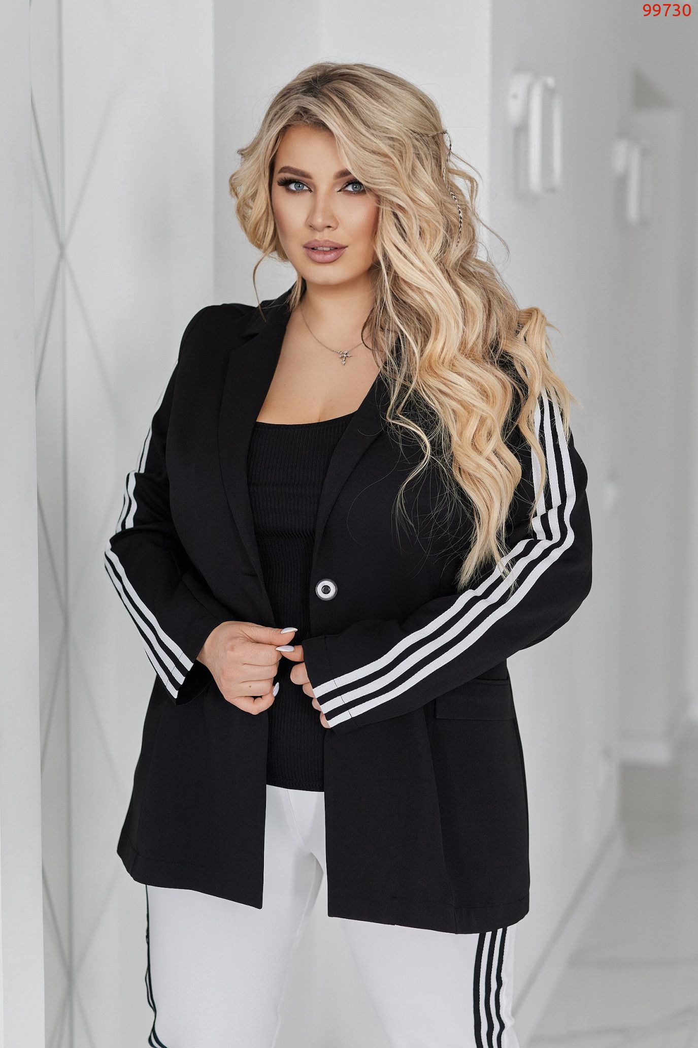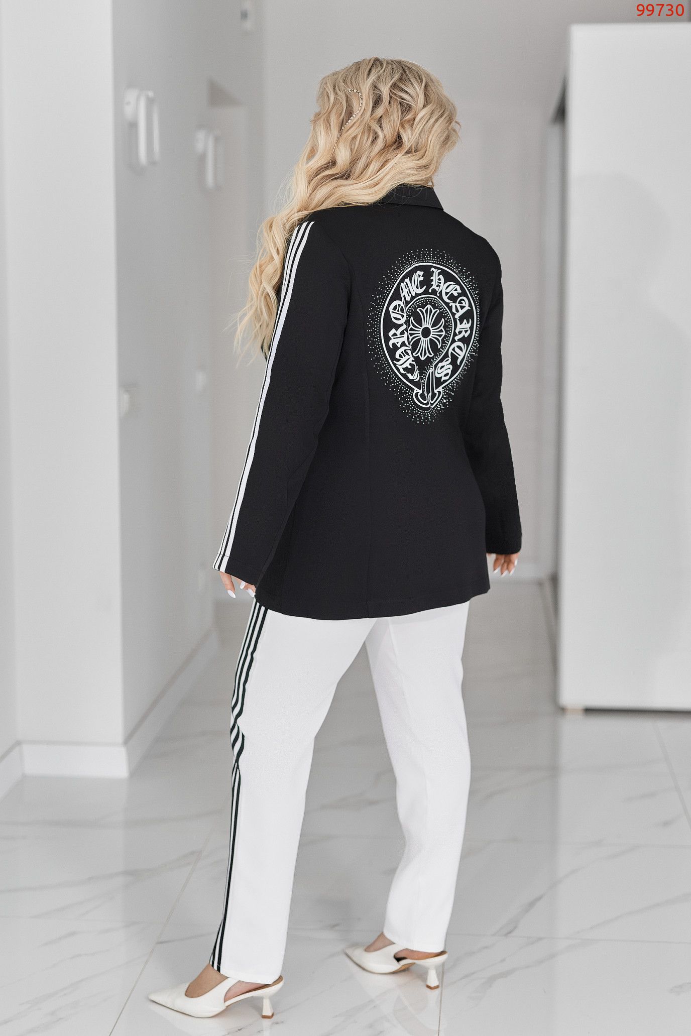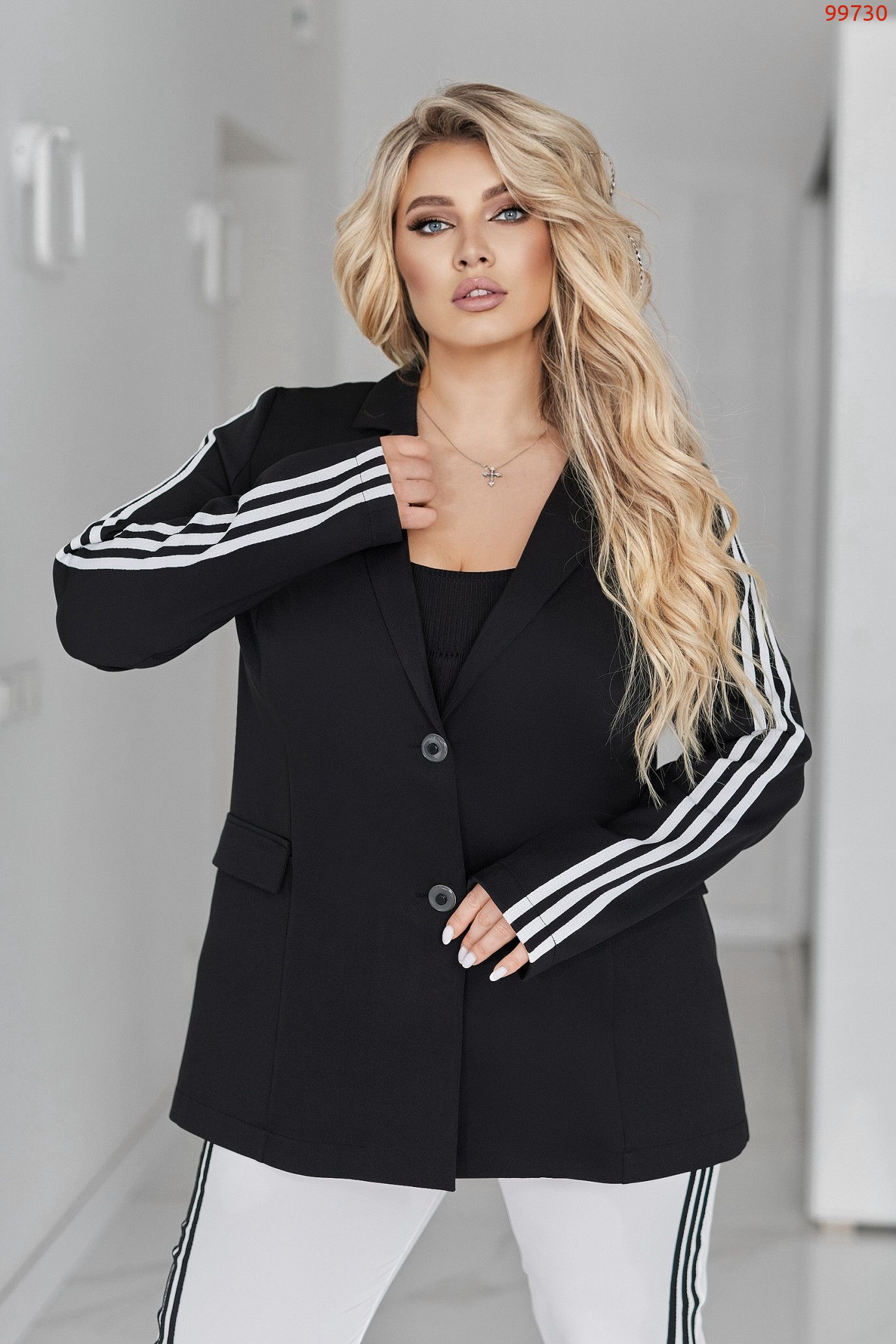 Рукава декоровані лампасами, що візуально витягують силует і додають динаміки образу.