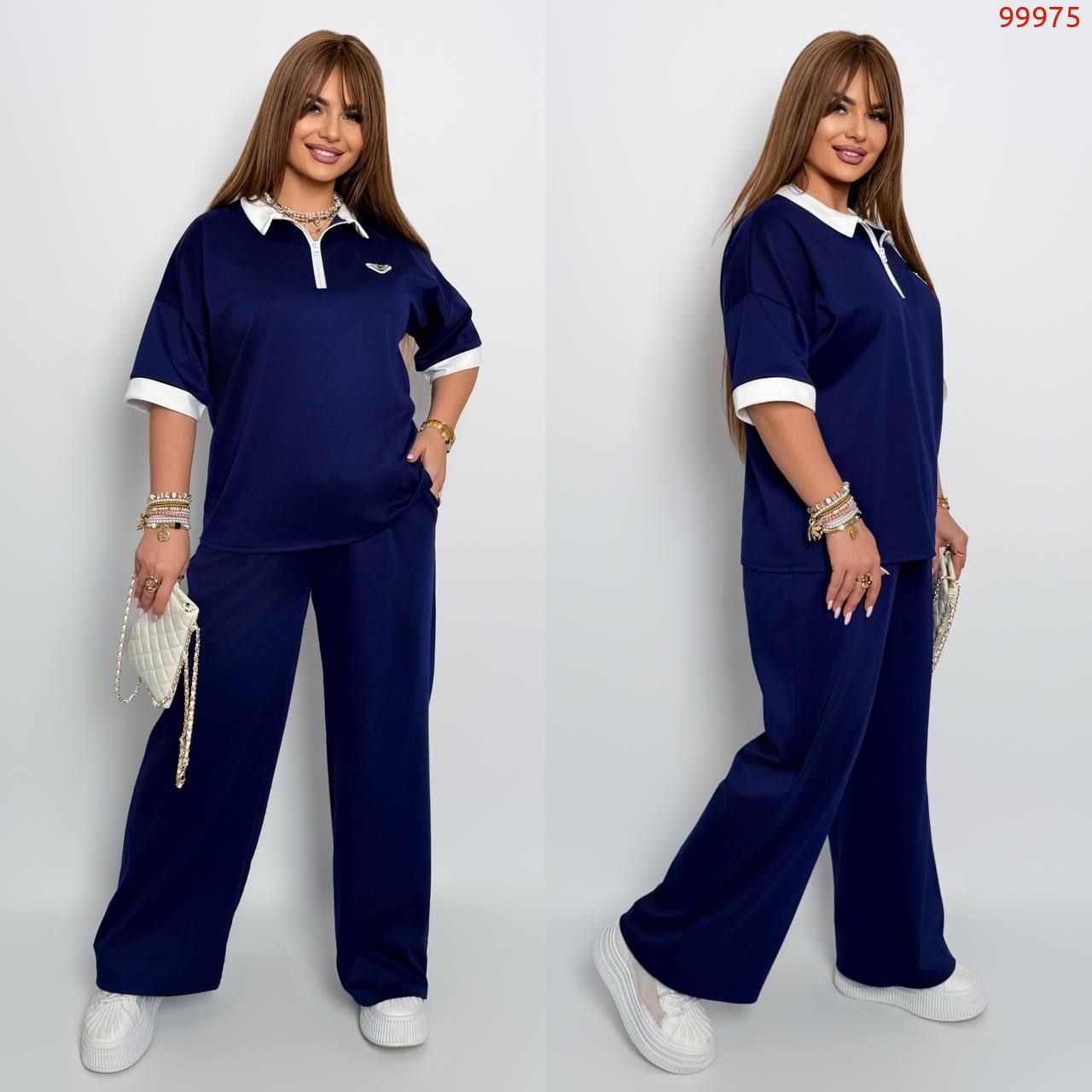 Широкі штани з високою посадкою , пояс на гумці , бічні кишені . Футболка - поло вільного покрою , з коміром , на блискавці .