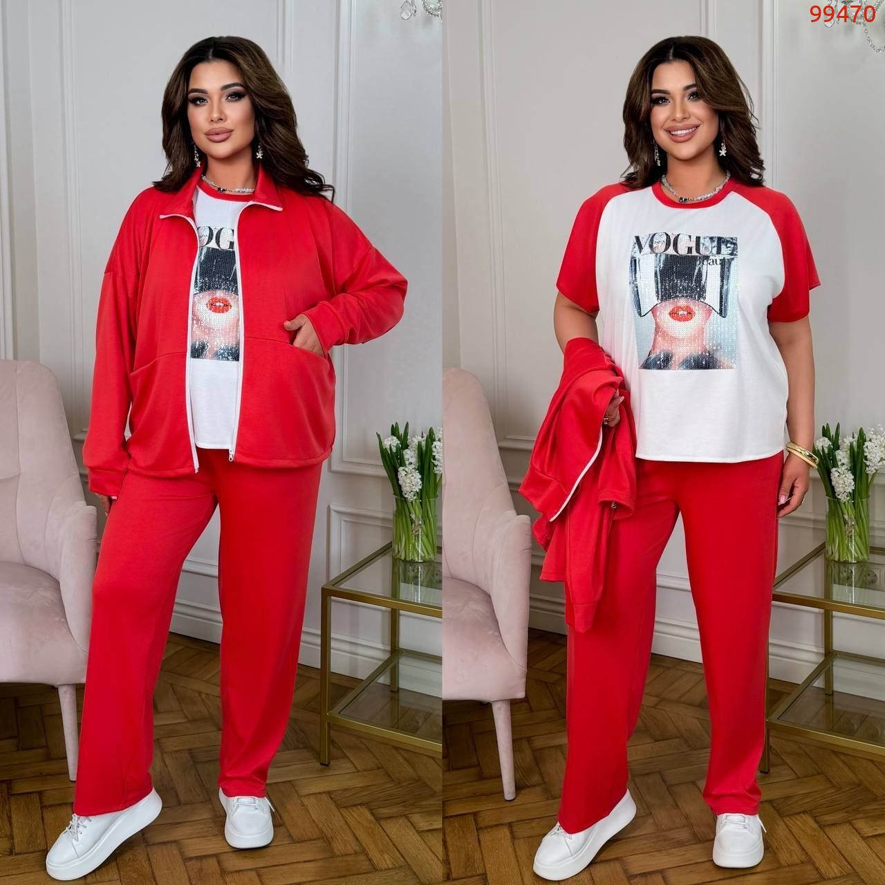Стильний костюм трійка : кофта + футболка + штани . Футболка прямого покрою , кофта з стійкою на блискавці , з кишенями , низ на фіксаторі . Штани з високою посадкою , пояс на гумці , з бічними кишенями .