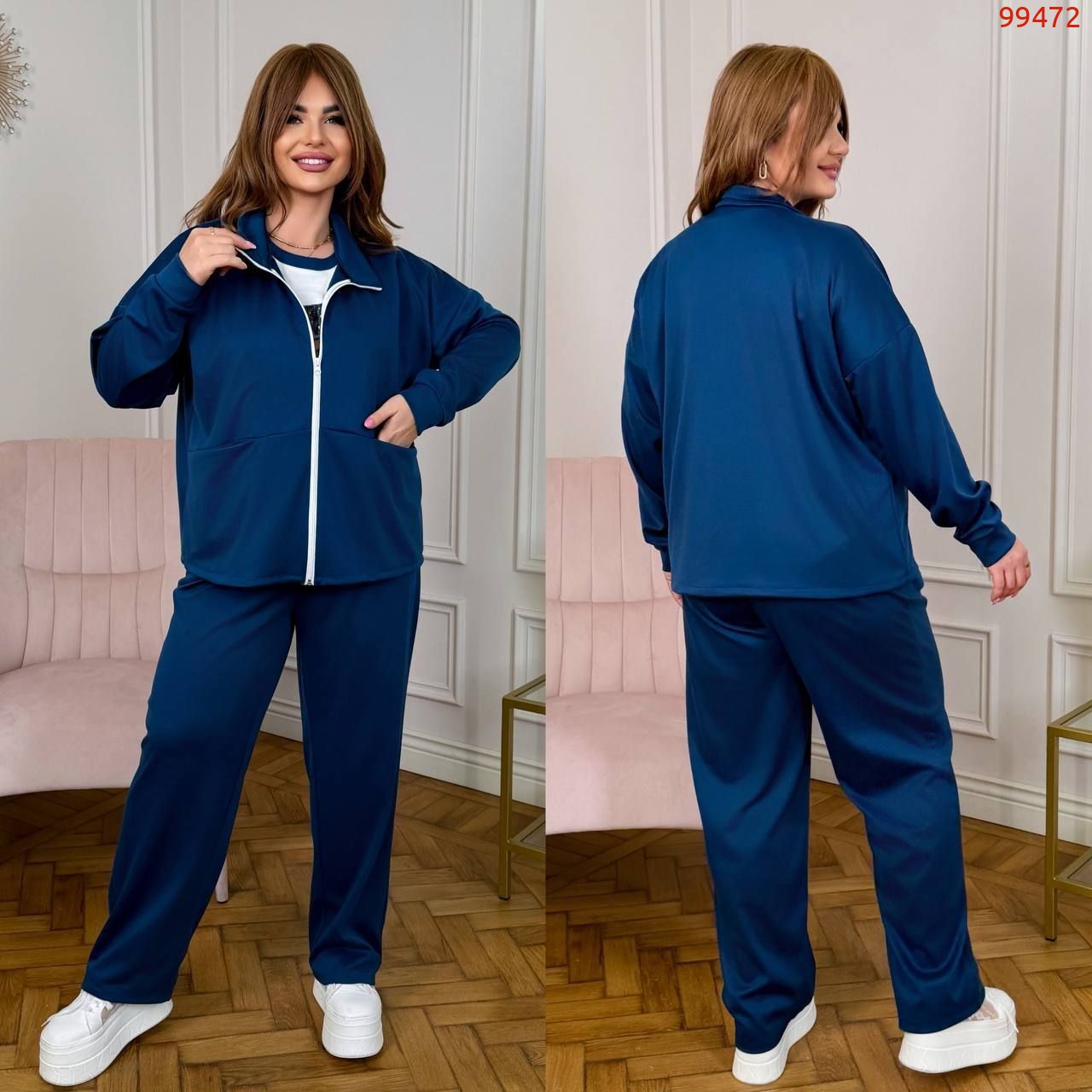 Стильний костюм трійка : кофта + футболка + штани . Футболка прямого покрою , кофта з стійкою на блискавці , з кишенями , низ на фіксаторі . Штани з високою посадкою , пояс на гумці , з бічними кишенями .