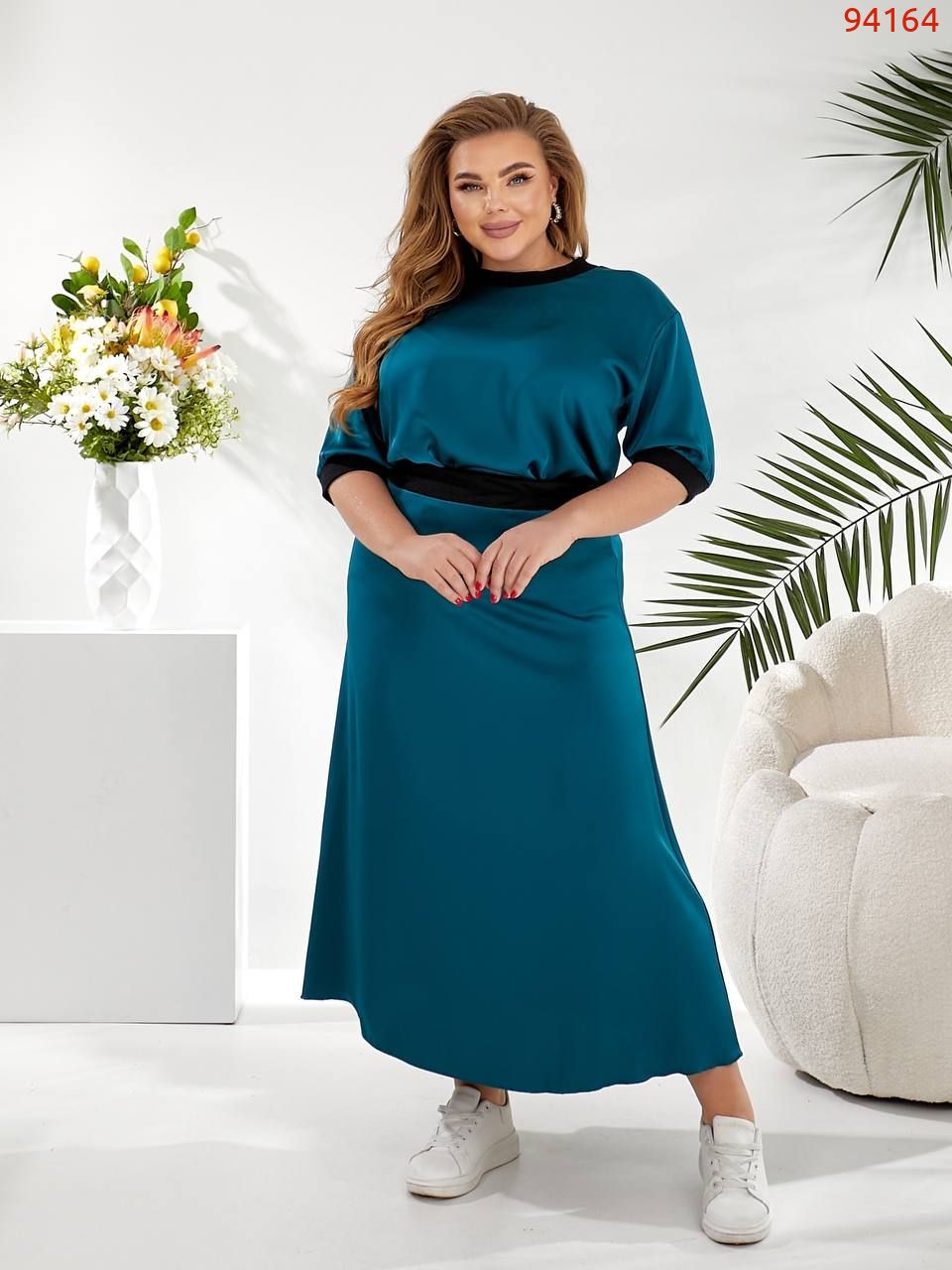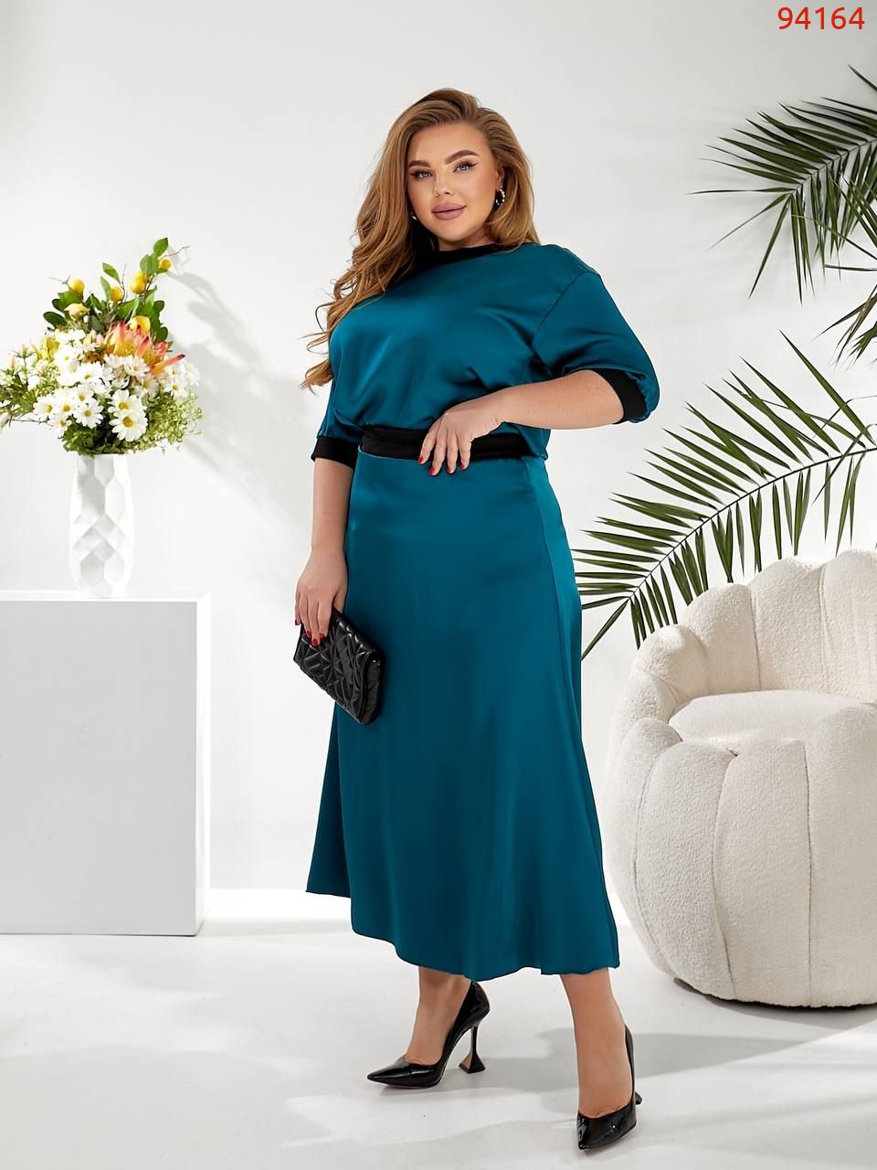 Талія підкреслена тонким чорним ременем, створюючи жіночний силует. Спідниця, що струмує, довжиною нижче коліна, що робить образ витонченим і елегантним.