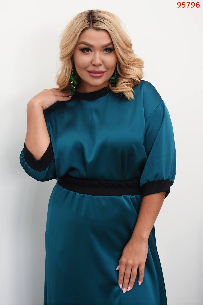 Костюм складається з вільної блузи з короткими рукавами та спідниці міді. У блузи округлий виріз горловини та контрастні чорні вставки на манжетах та комірі, що додає виразності образу.