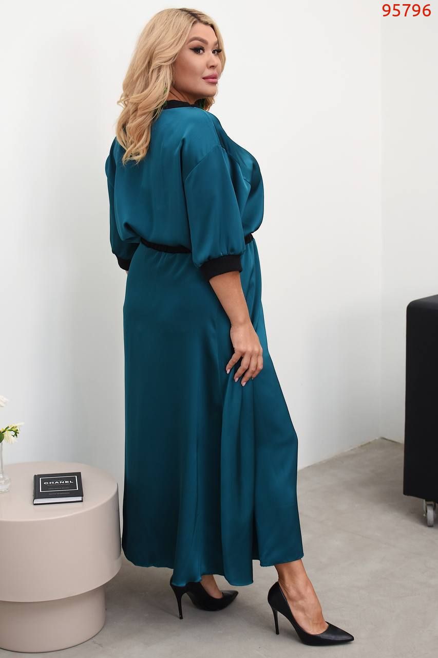 Талія підкреслена тонким чорним ременем, створюючи жіночний силует. Спідниця, що струмує, довжиною нижче коліна, що робить образ витонченим і елегантним.