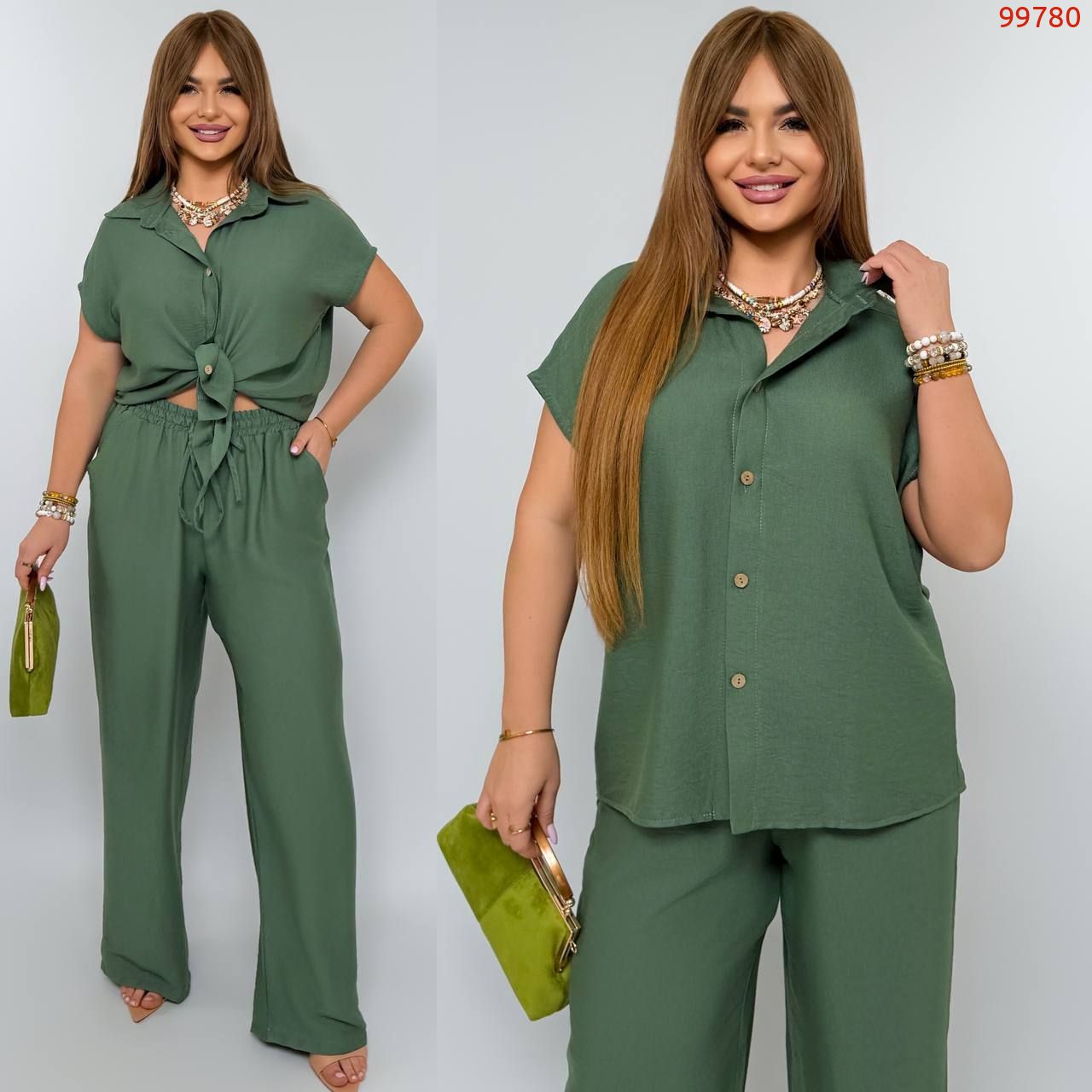 Костюм з легкого льону: штани з посадкою вище середнього на гумці та куліскою на поясі, з кишенями у бічних швах + сорочка на ґудзиках