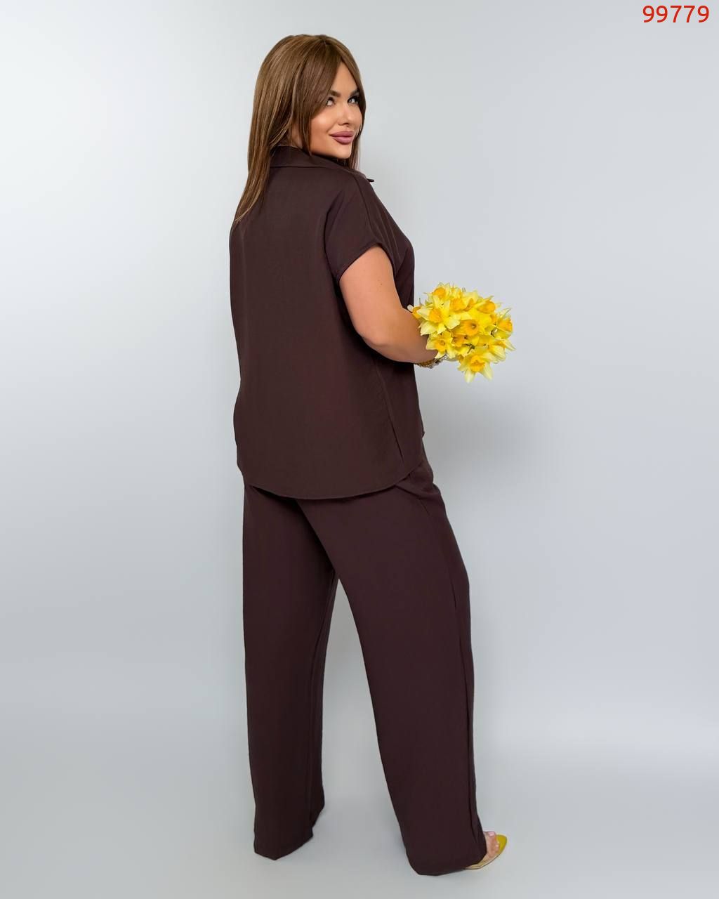 Костюм з легкого льону: штани з посадкою вище середнього на гумці та куліскою на поясі, з кишенями у бічних швах + сорочка на ґудзиках