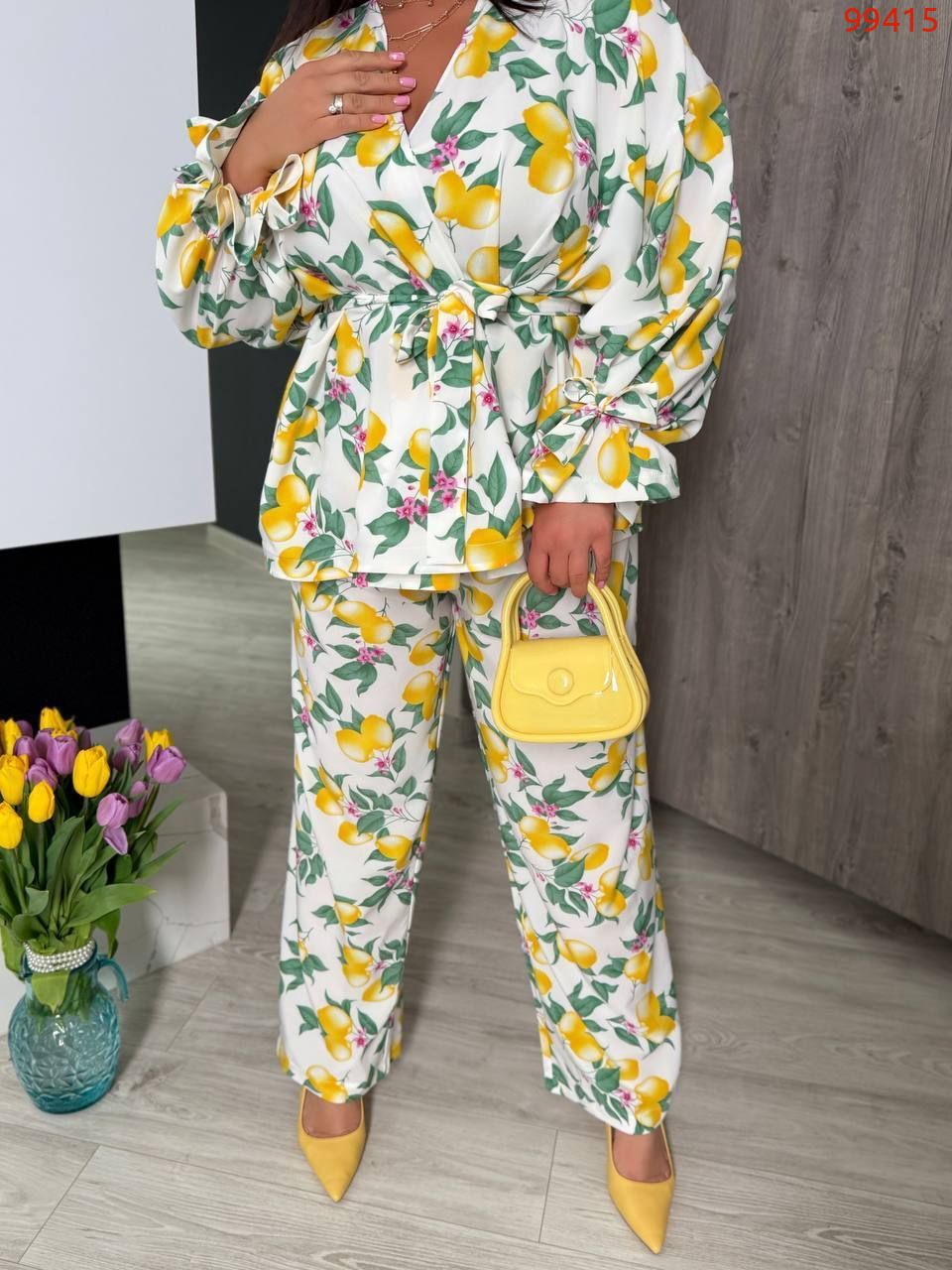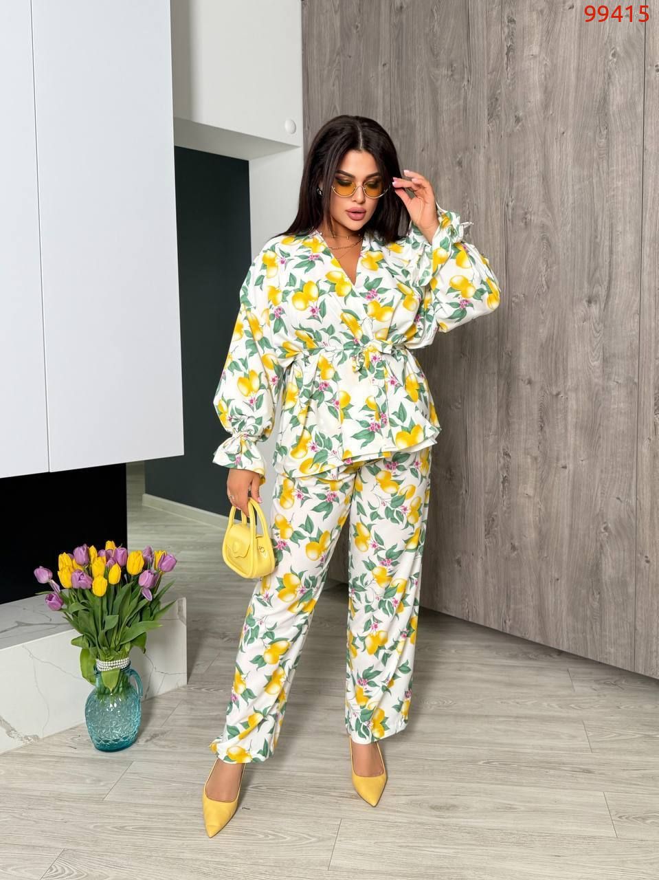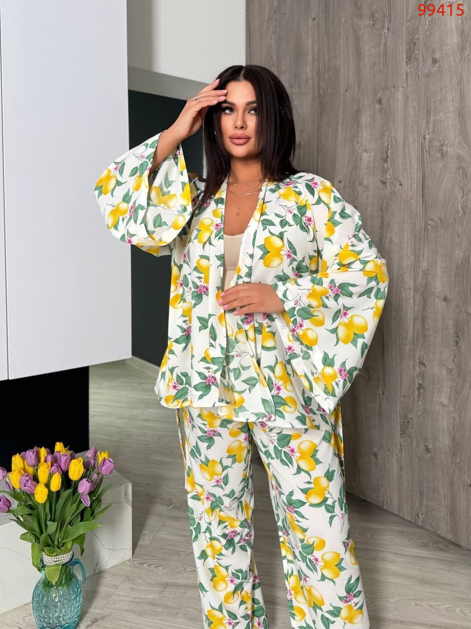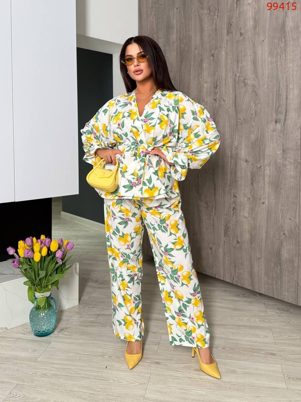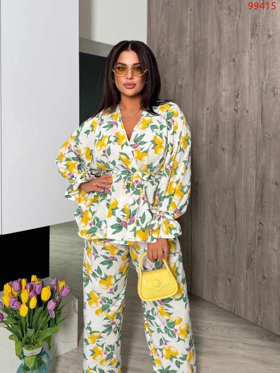 Довжина брюк 77/110. Пояс на гумці, висока посадка. Кардиган одягається на запах, підвʼязується поясом . Рукава внизу широкі, є знімни завʼязки, якими можна зробити іншу форму рукава завʼязав їх.