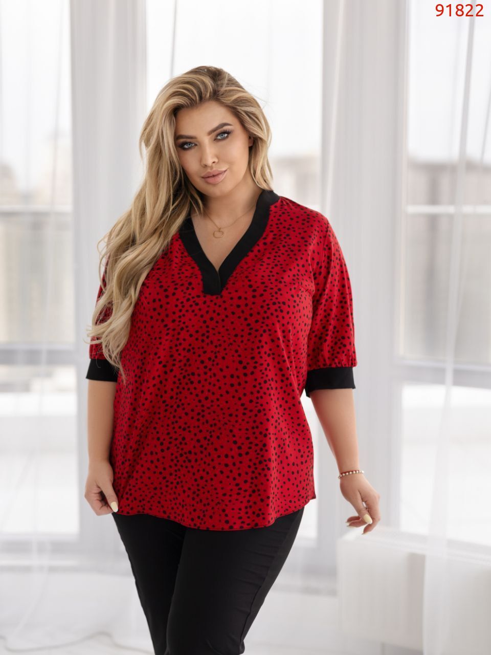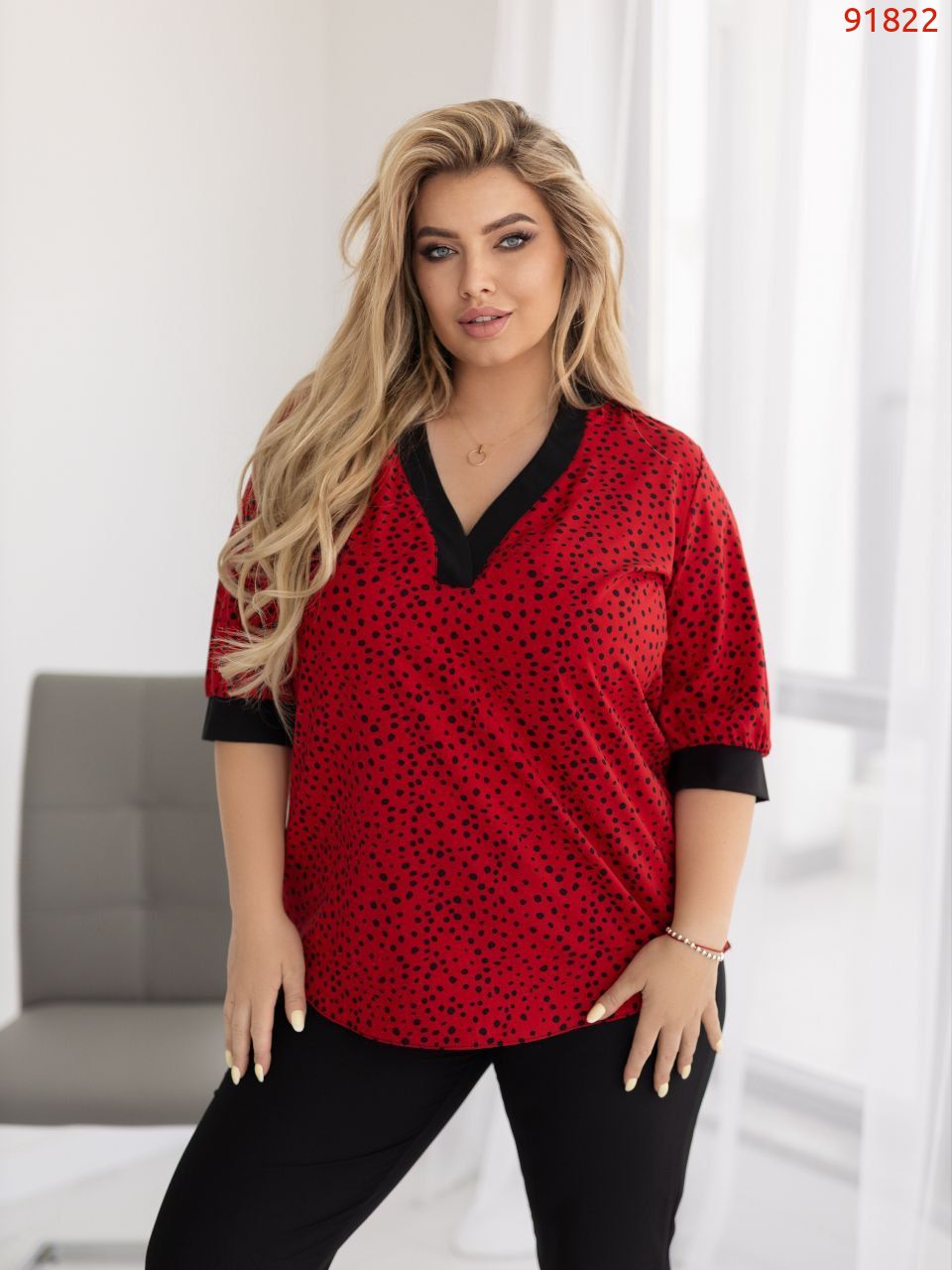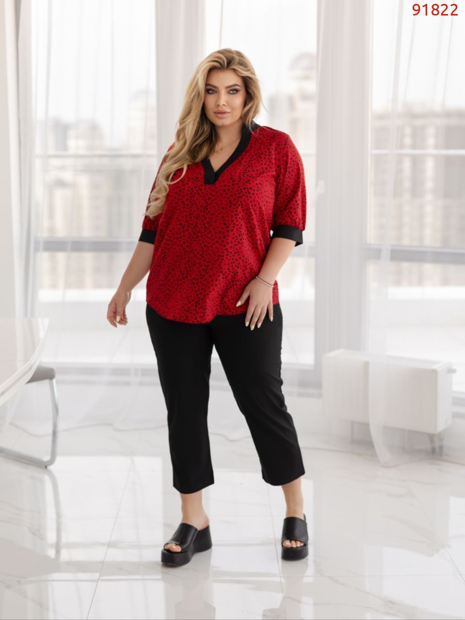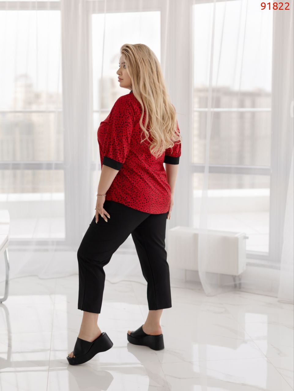 Гарний, літній костюм, підійде для прогулянок. Легка блузка з гарним вирізом на груді підкреслить вашу жіночність , рукаві іде фонариком.