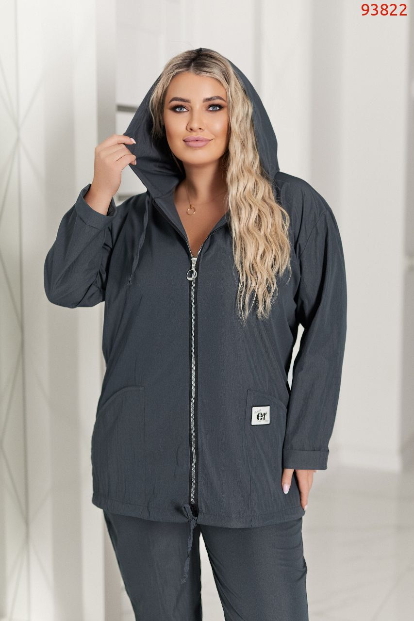 По низу виробу та капюшона доповнена кулісами, має дві зручні кишені .Штани на резінці мають зручну посадку з кишенями, по низу мають манжети.