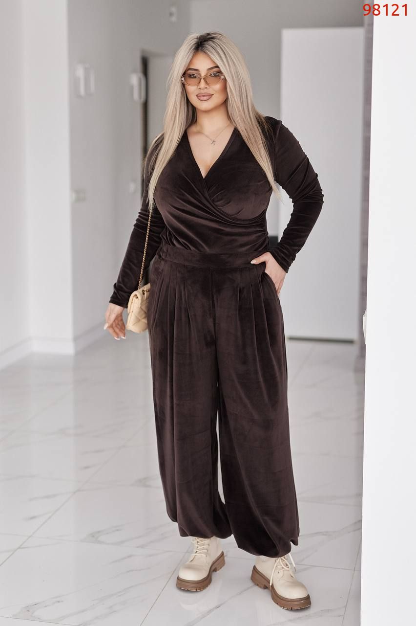 Стильний жіночий костюм у трендових відтінках, що поєднує комфорт і витончену жіночність. Виконаний з м’якого, приємного до тіла велюру з легким благородним блиском, який красиво переливається при русі.