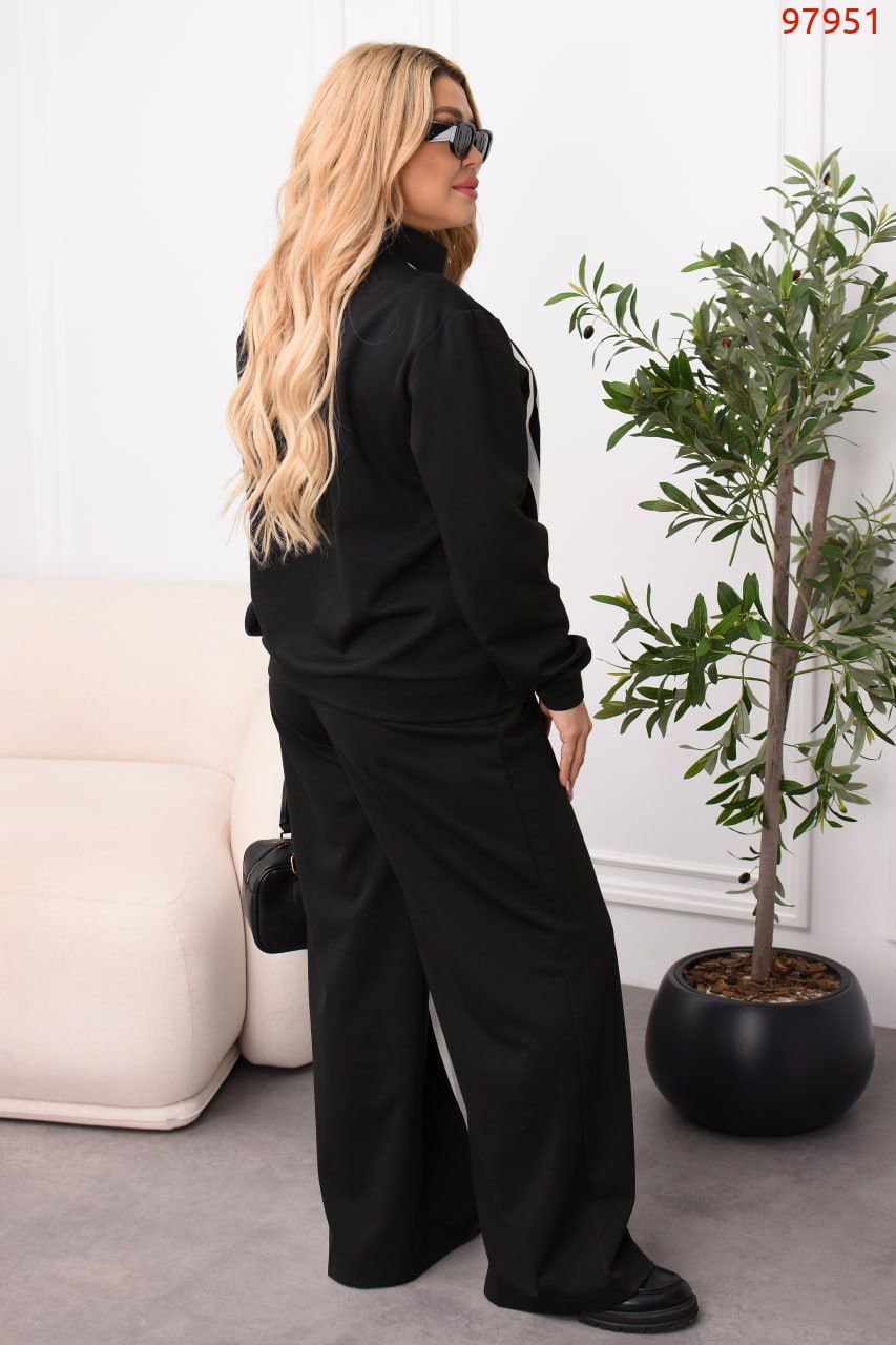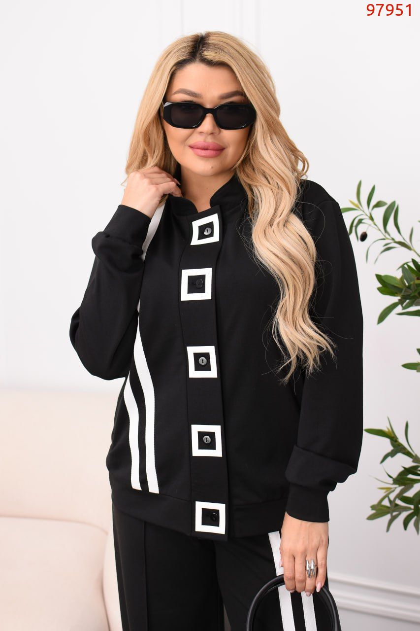 Стильний брючний костюм з еластичної тканини для тих, хто цінує баланс комфорту й елегантності. Лампаси додають динаміки, а геометричний декор (квадрат) на кофті – стильний акцент. Кофта на ґудзиках по всій довжині з прорізними кишенями. Вільні штани середньої посадки з еластичною резинкою на поясі – зручні на щодень і для поїздок.