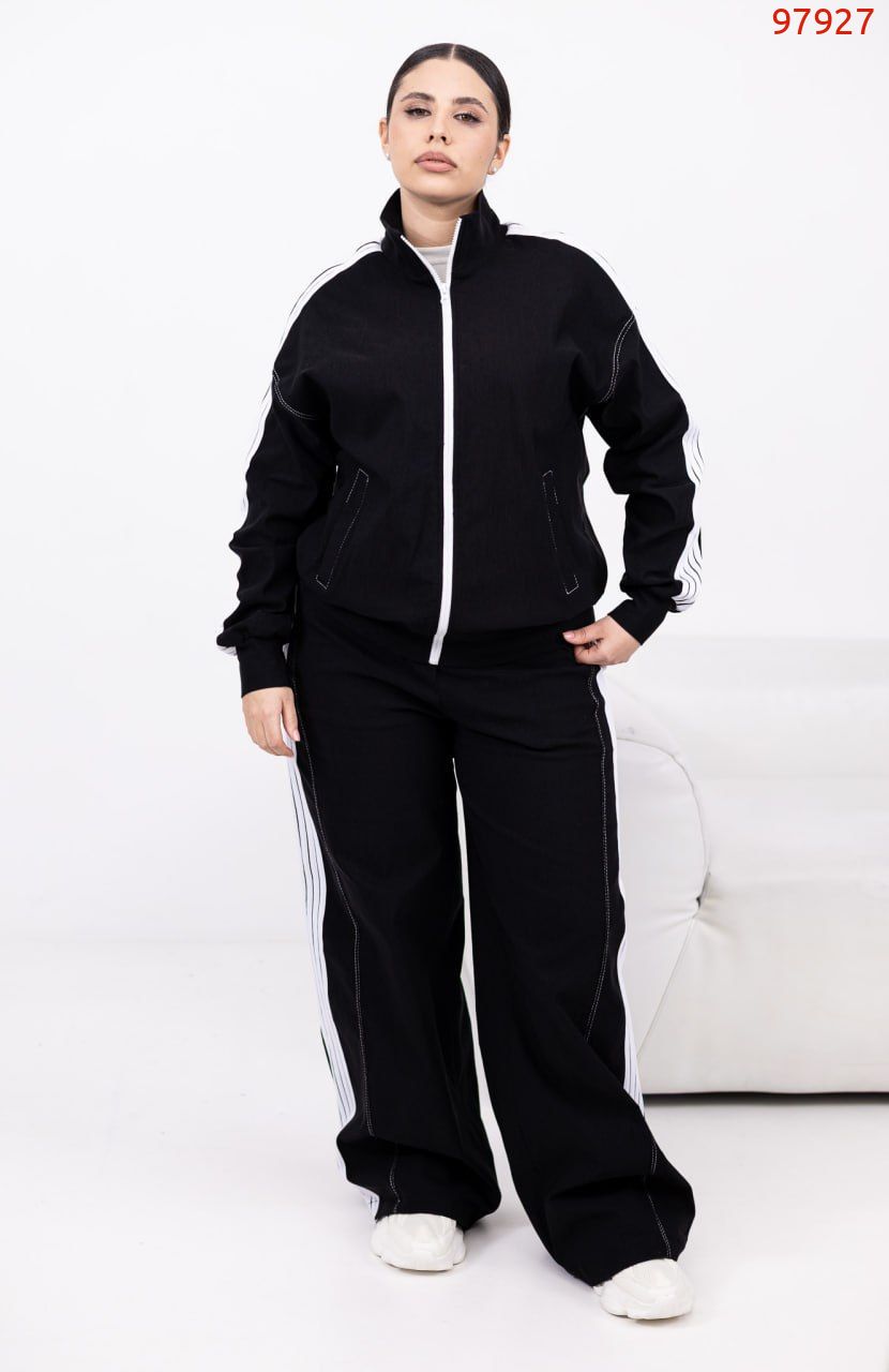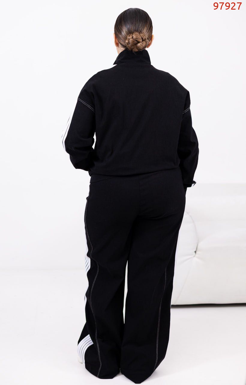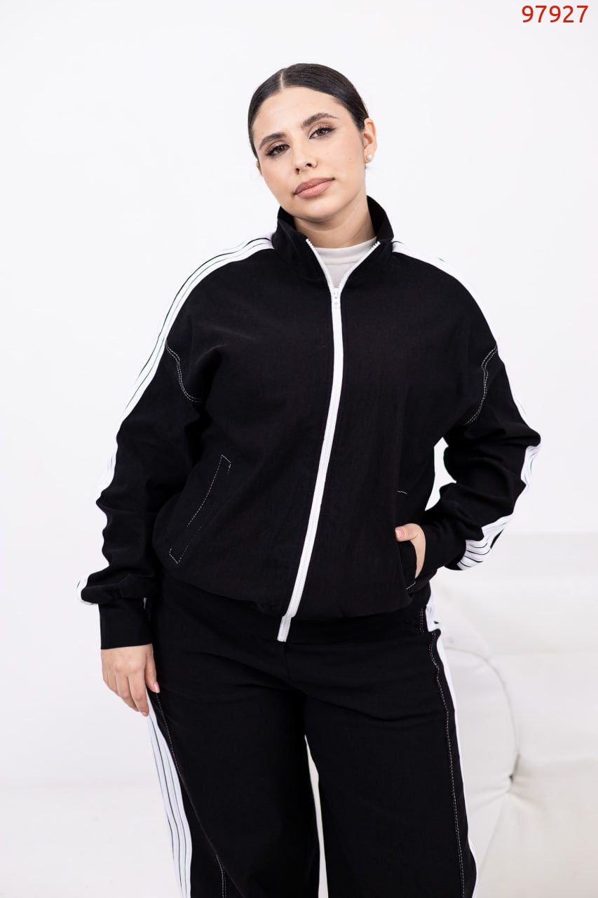 Стильний брючний костюм з еластичної тканини для тих, хто любить баланс комфорту й елегантності. Кофта та штани оздоблені лампасами: кофта на блискавці по всій довжині з прорізними кишенями та еластичним манжетом внизу. Штани середньої посадки з еластичною резинкою на поясі у стилі палаццо – витягують силует і пасують до будь-якого взуття, від кросівок до лоферів.