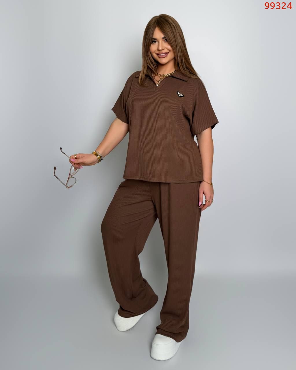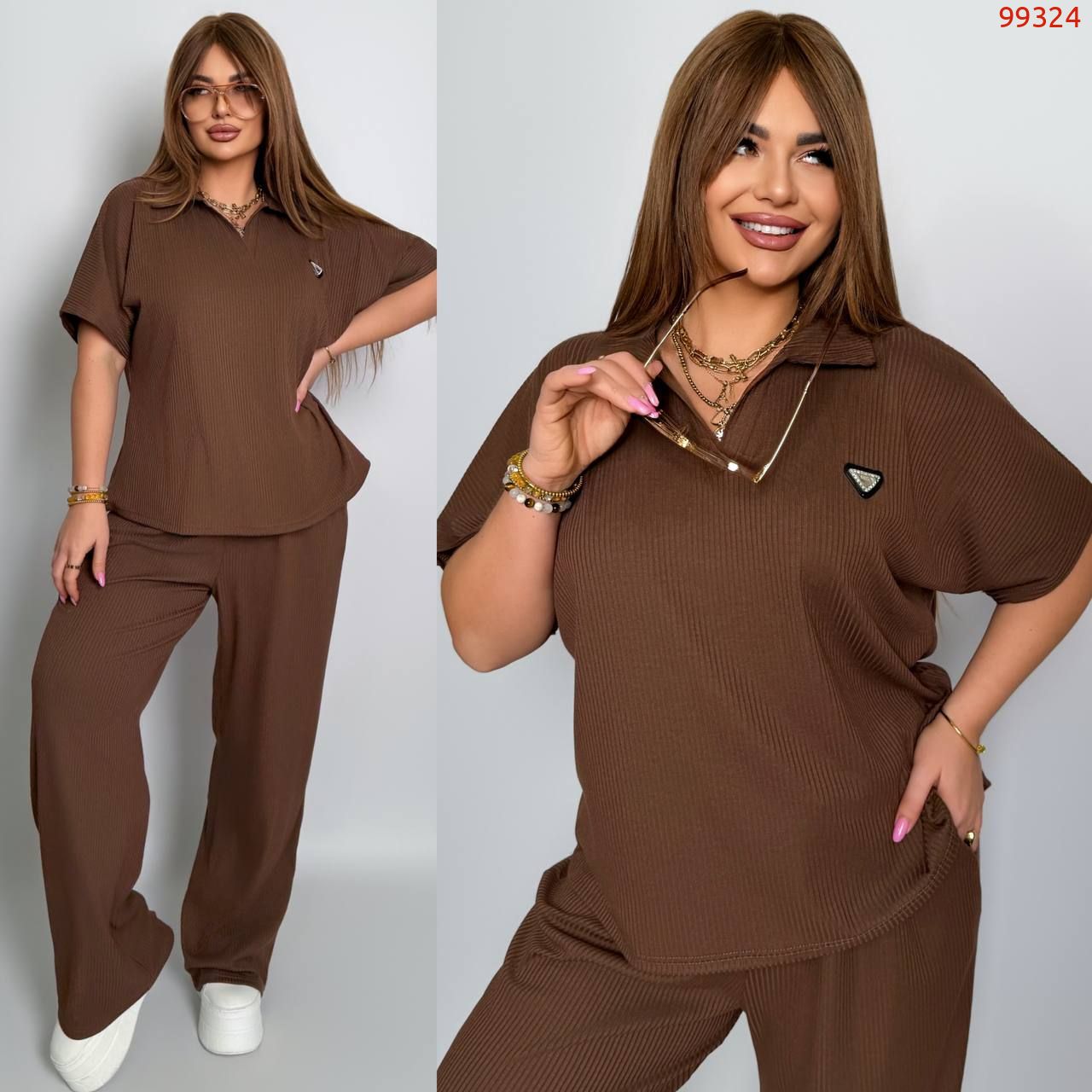 Стильний комфортний костюм “Barcelona” з трикотажу рубчик хб стрейч: футболка у стилі поло оверсайз з Акс + штани прямі розширені з високою посадкою з кішенями у бічних швах, з куліскою на поясі