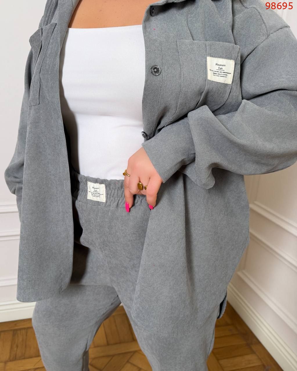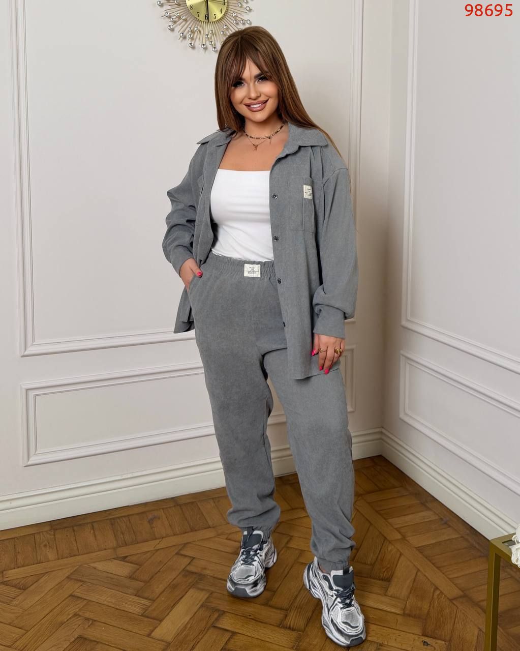 Стильний прогулянковий костюм із мікровельвету: Сорочка вільного крою на гудзиказ, з робочими кишенями + джогери з високою посадкою з кишенями у бічних швах. На поясі та знизу на гумці.