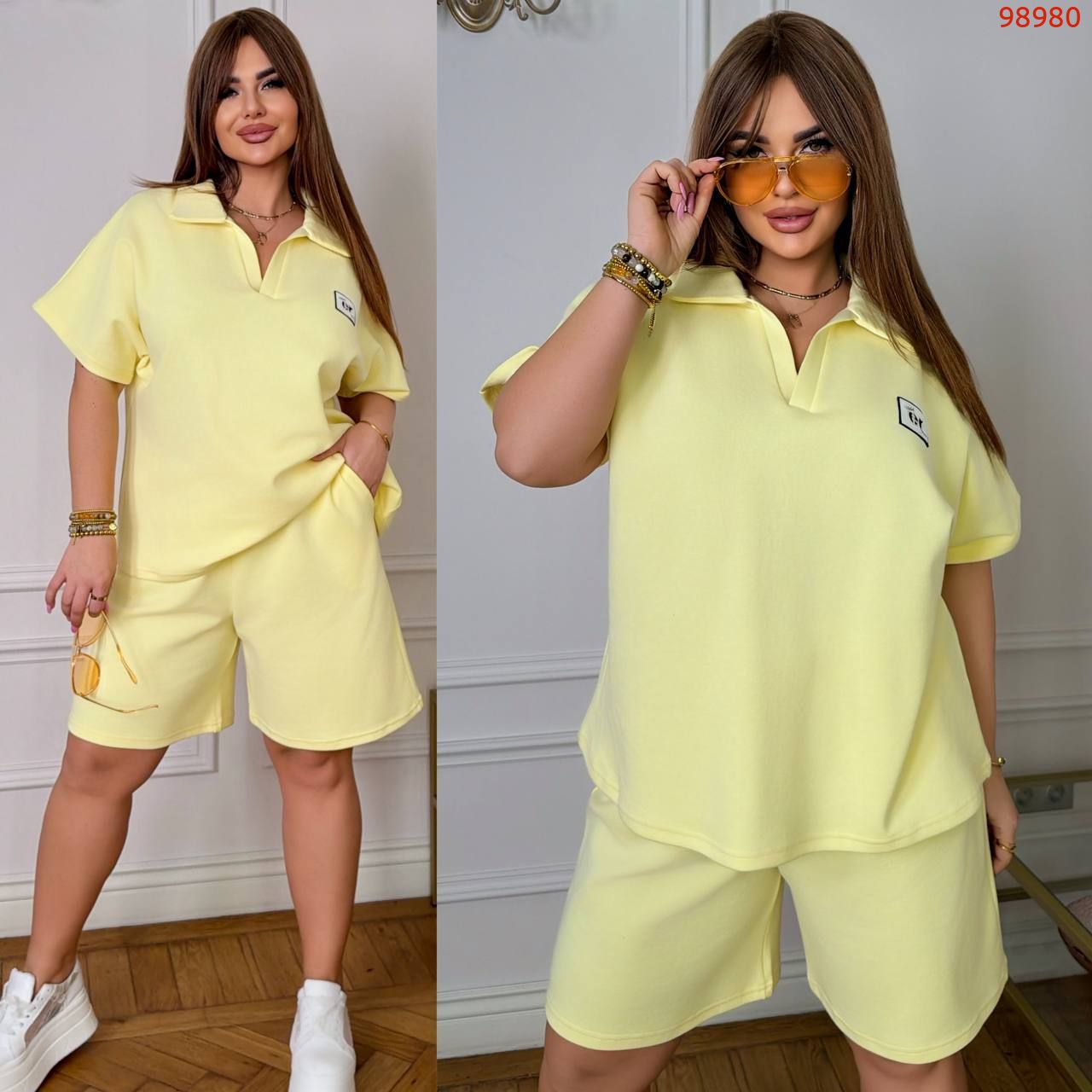 футболка поло у стилі оверсайз + шорти з високою посадкою з кішенями у бічних швах, з куліскою на поясі)