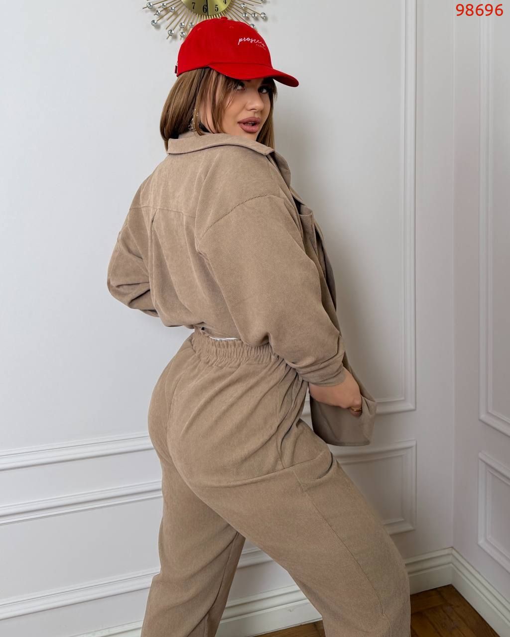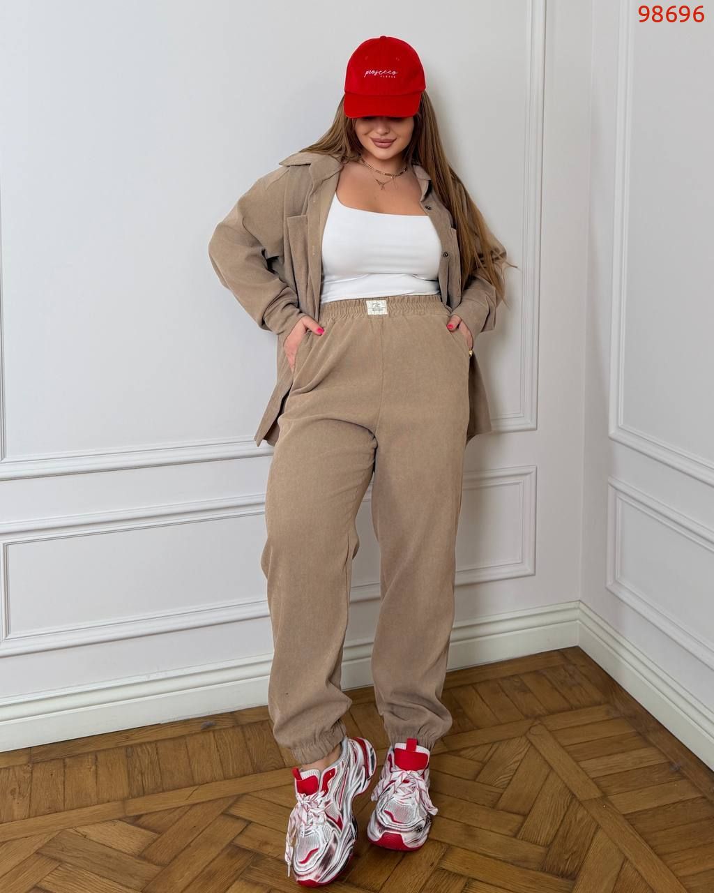 Стильний прогулянковий костюм із мікровельвету: Сорочка вільного крою на гудзиказ, з робочими кишенями + джогери з високою посадкою з кишенями у бічних швах. На поясі та знизу на гумці.