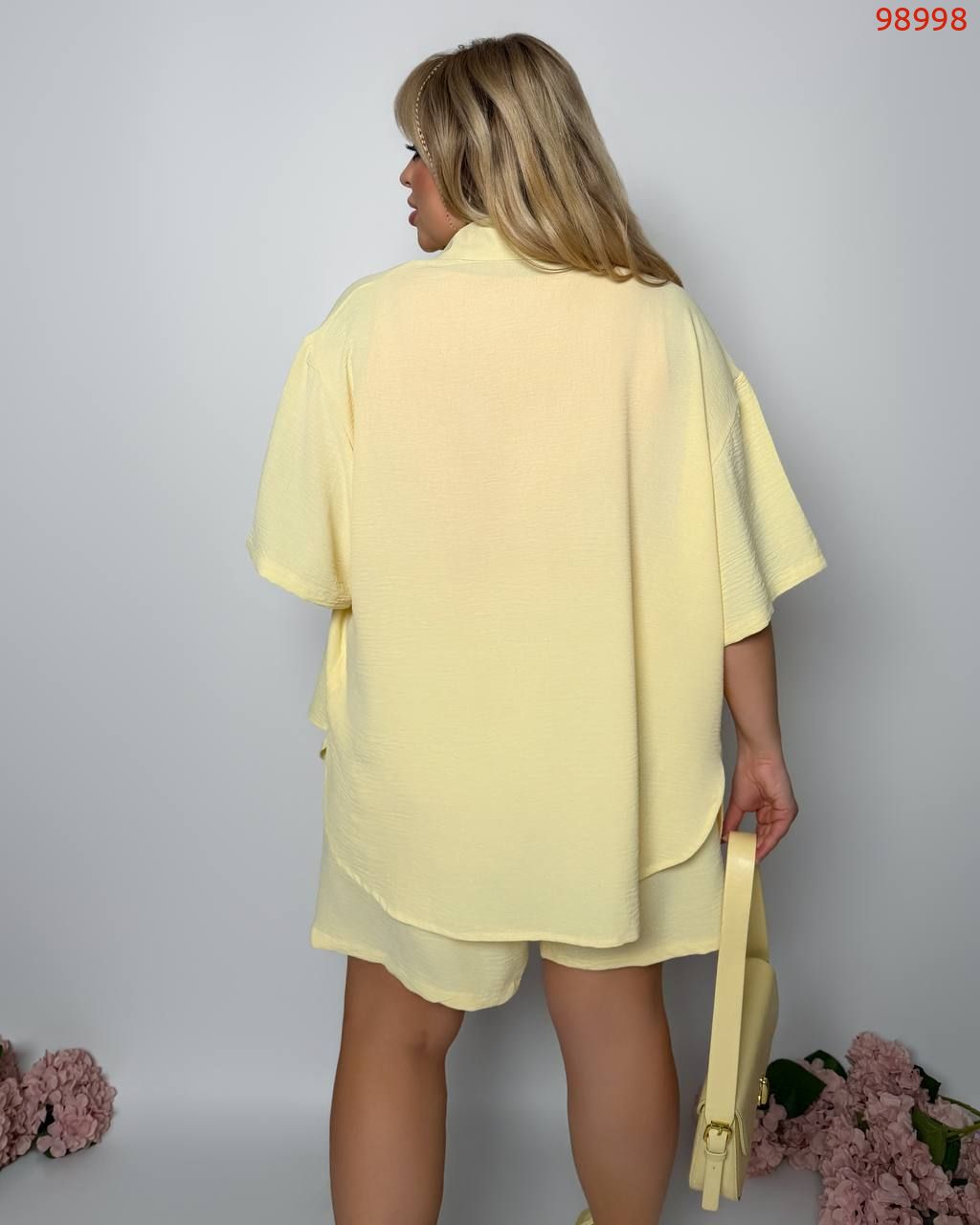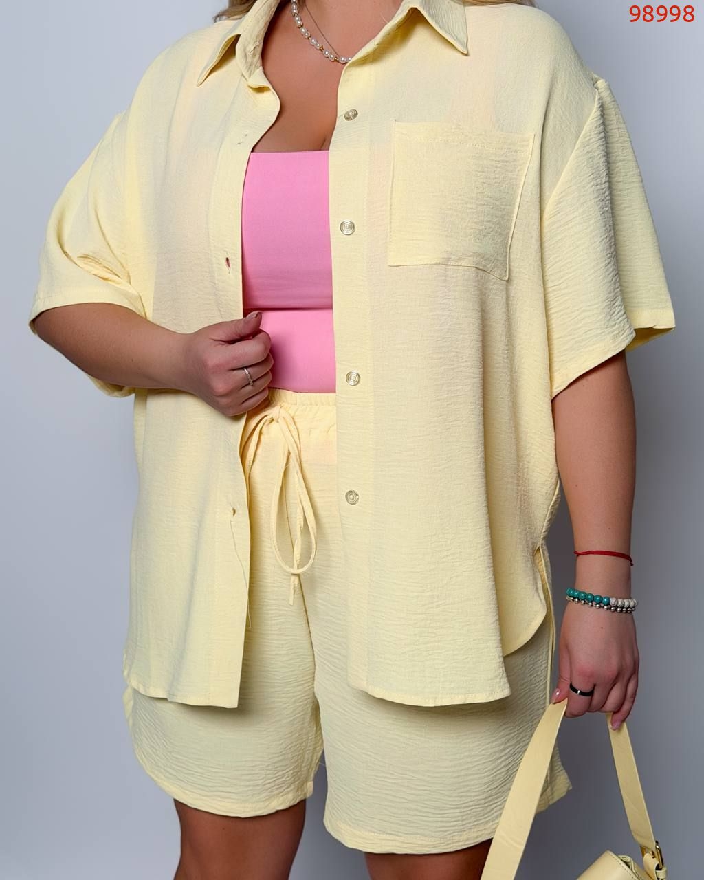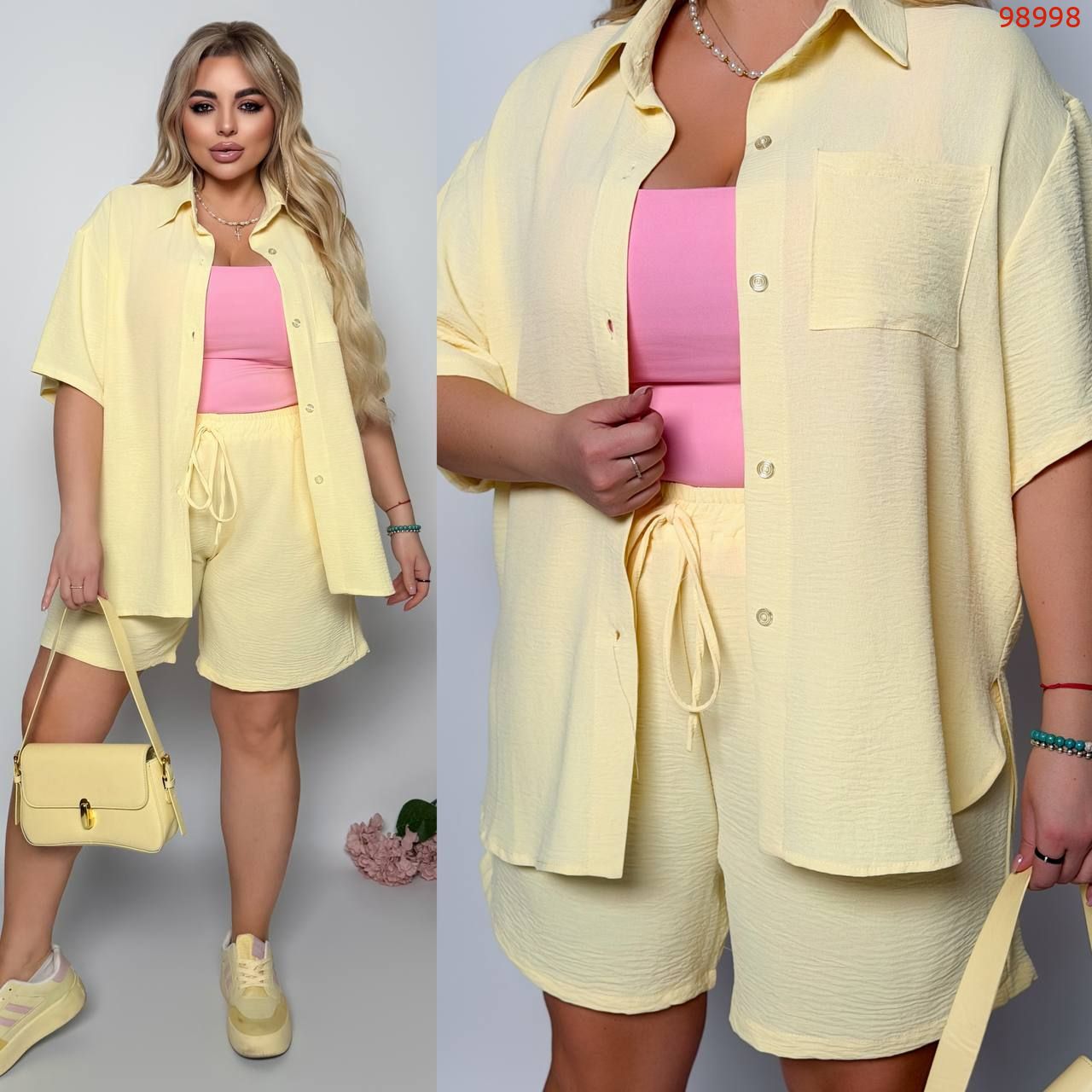 Стильний прогулянковий костюм з креп софту: Сорочка на гудзиках з кишенею , по низу з розрізами по боках + шорти з високою посадкою на гумці, з кишенями у бічних швах