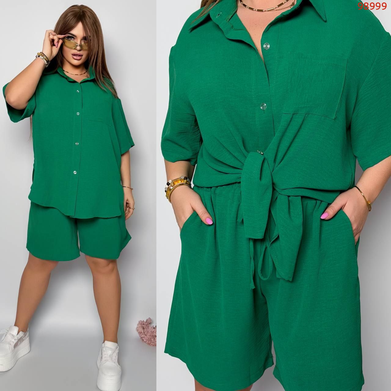 Стильний прогулянковий костюм з креп софту: Сорочка на гудзиках з кишенею , по низу з розрізами по боках + шорти з високою посадкою на гумці, з кишенями у бічних швах