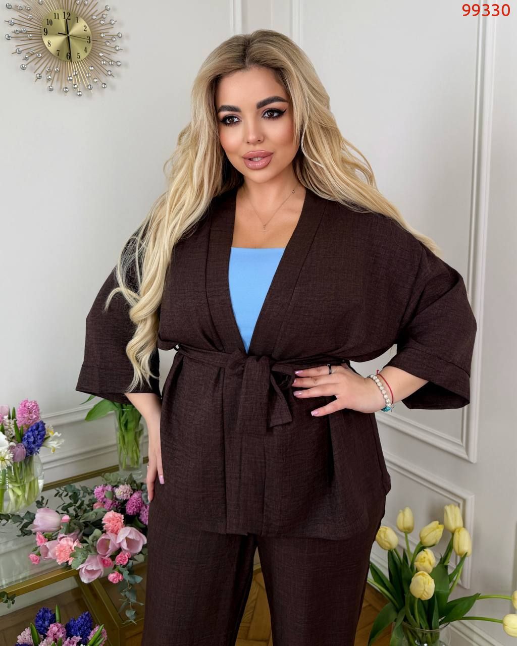 Стильний прогулянковий костюм зі льону «Бохо»: вільний кардиган під пояс + Штани з високою посадкою на гумці, з кишенями у бічних швах та куліскою на поясі.