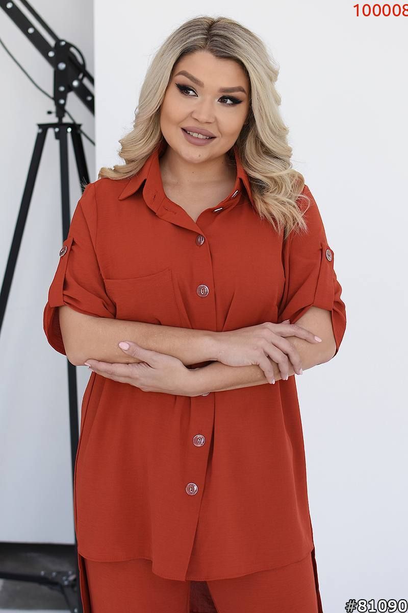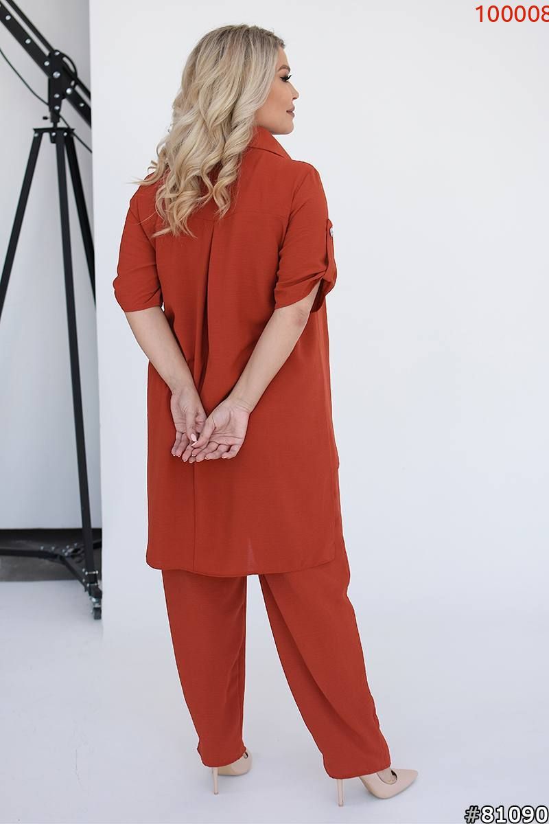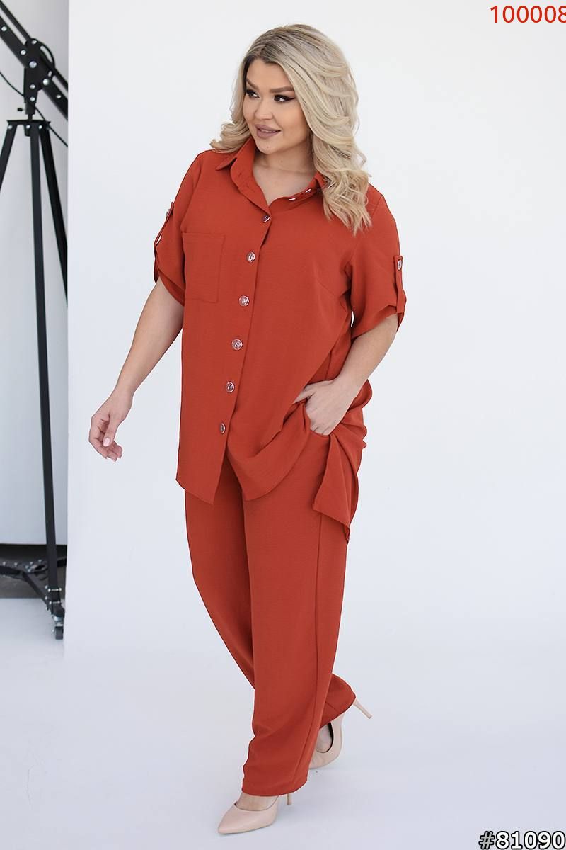 Костюм складається з штанів та сорочки. Штани мають прямий крій та комфортну посадку з гумкою на талії та манжетам. Сорочка вільного фасону з короткими рукавами та застібкою на гудзики. Стильний і сучасний комплект, що чудово підходить для повсякденного гардеробу.