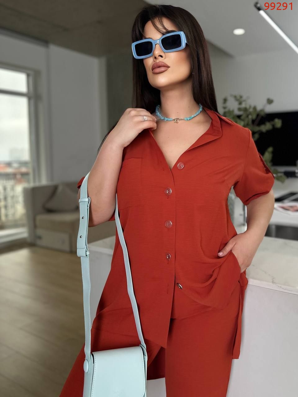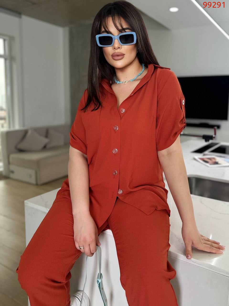 Костюм складається з штанів та сорочки. Штани мають прямий крій та комфортну посадку з гумкою на талії та манжетам. Сорочка вільного фасону з короткими рукавами та застібкою на гудзики. Стильний і сучасний комплект, що чудово підходить для повсякденного гардеробу.