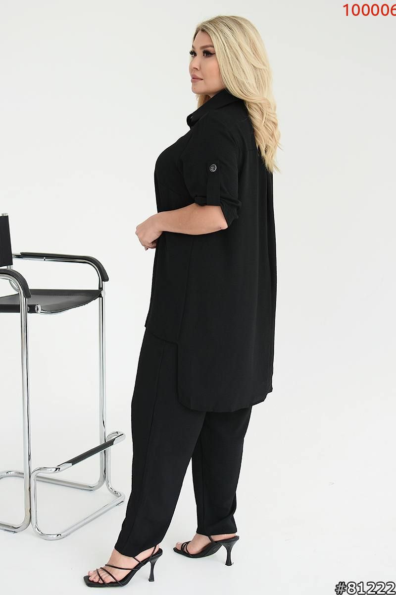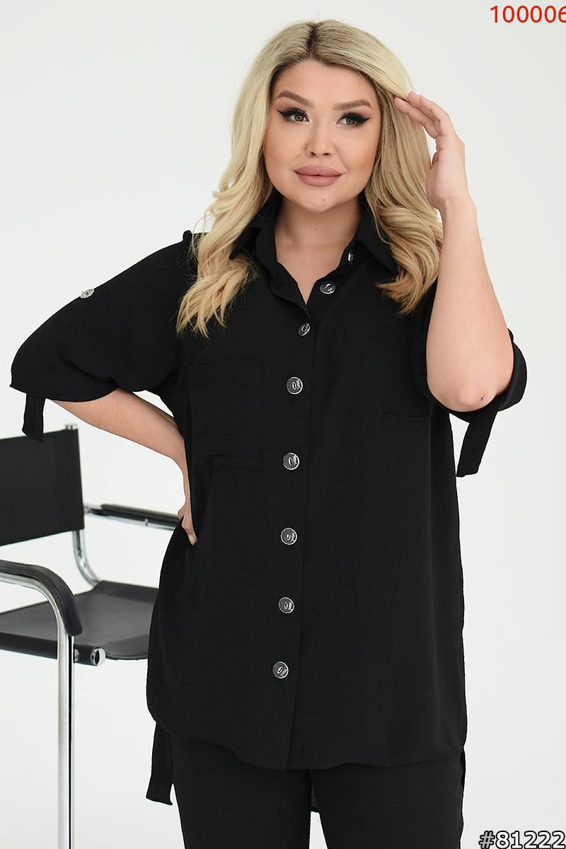 Костюм складається з штанів та сорочки. Штани мають прямий крій та комфортну посадку з гумкою на талії та манжетам. Сорочка вільного фасону з короткими рукавами та застібкою на гудзики. Стильний і сучасний комплект, що чудово підходить для повсякденного гардеробу.