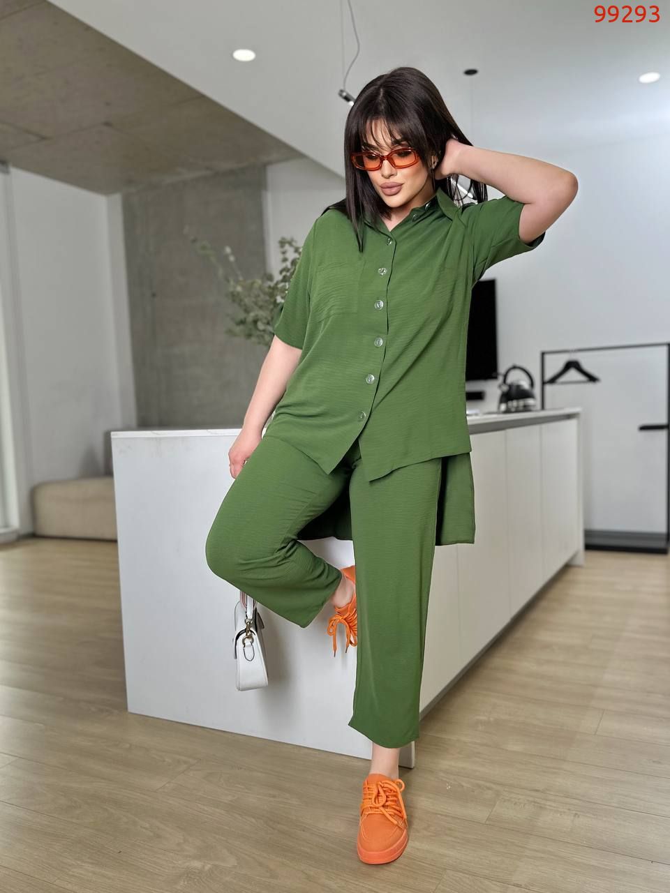 Костюм складається з штанів та сорочки. Штани мають прямий крій та комфортну посадку з гумкою на талії та манжетам. Сорочка вільного фасону з короткими рукавами та застібкою на гудзики. Стильний і сучасний комплект, що чудово підходить для повсякденного гардеробу.