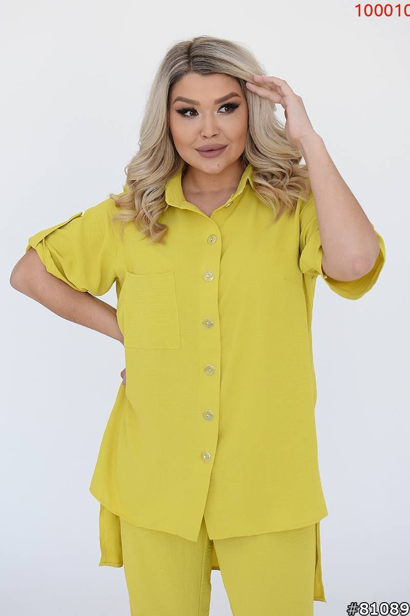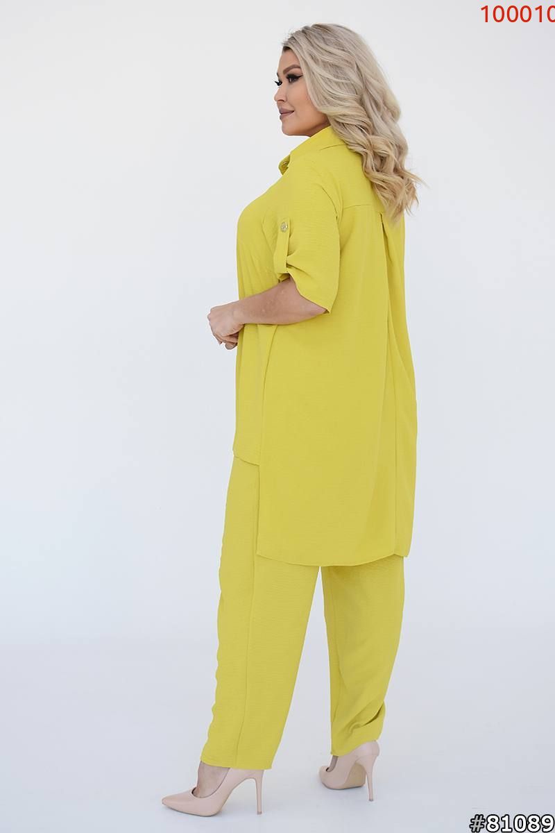 Костюм складається з штанів та сорочки. Штани мають прямий крій та комфортну посадку з гумкою на талії та манжетам. Сорочка вільного фасону з короткими рукавами та застібкою на гудзики. Стильний і сучасний комплект, що чудово підходить для повсякденного гардеробу.