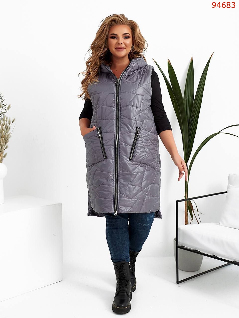 Стильна стегана жилетка прямого крою з накладними кишенями, зручний глибокий капюшон, якісна фурнітура, нашивка
