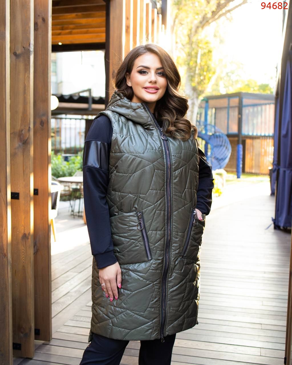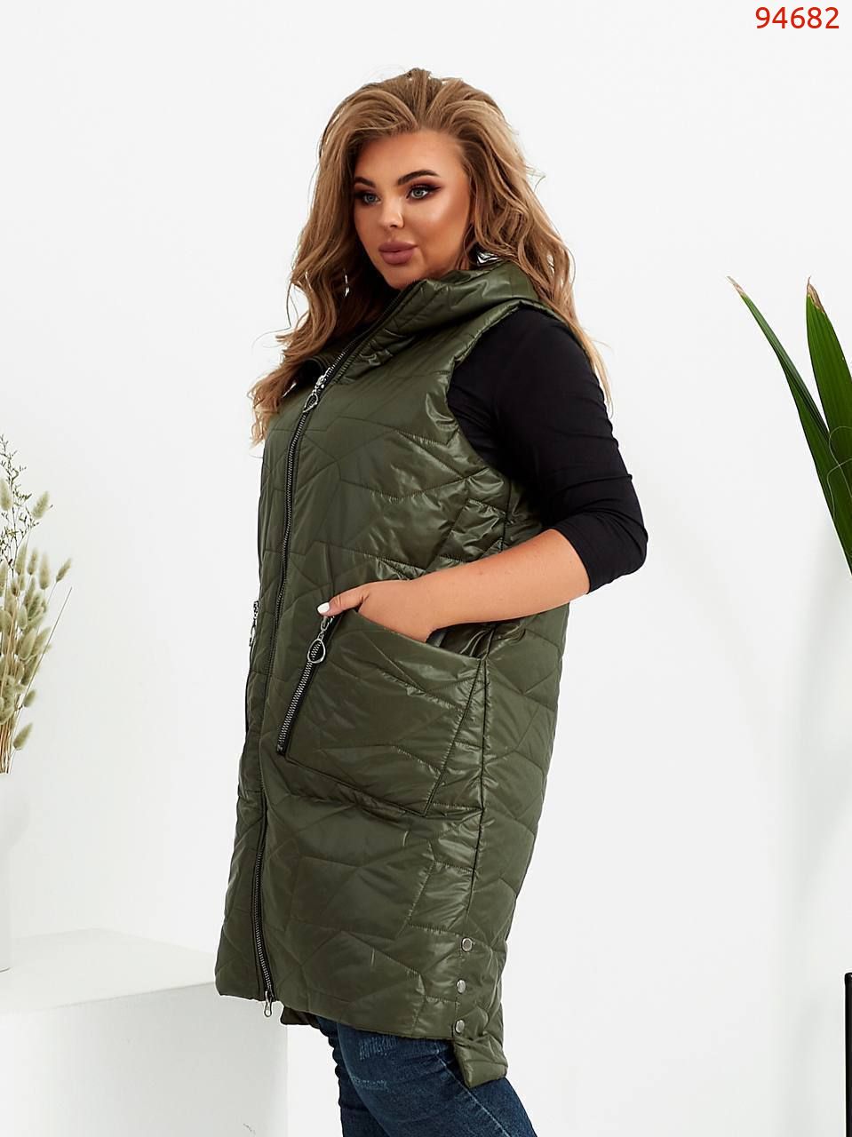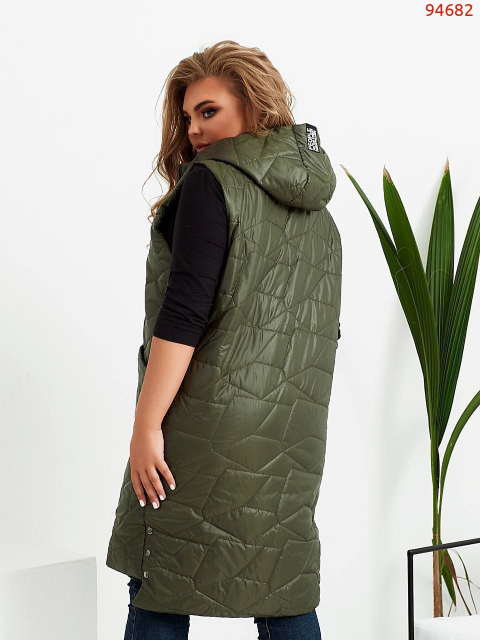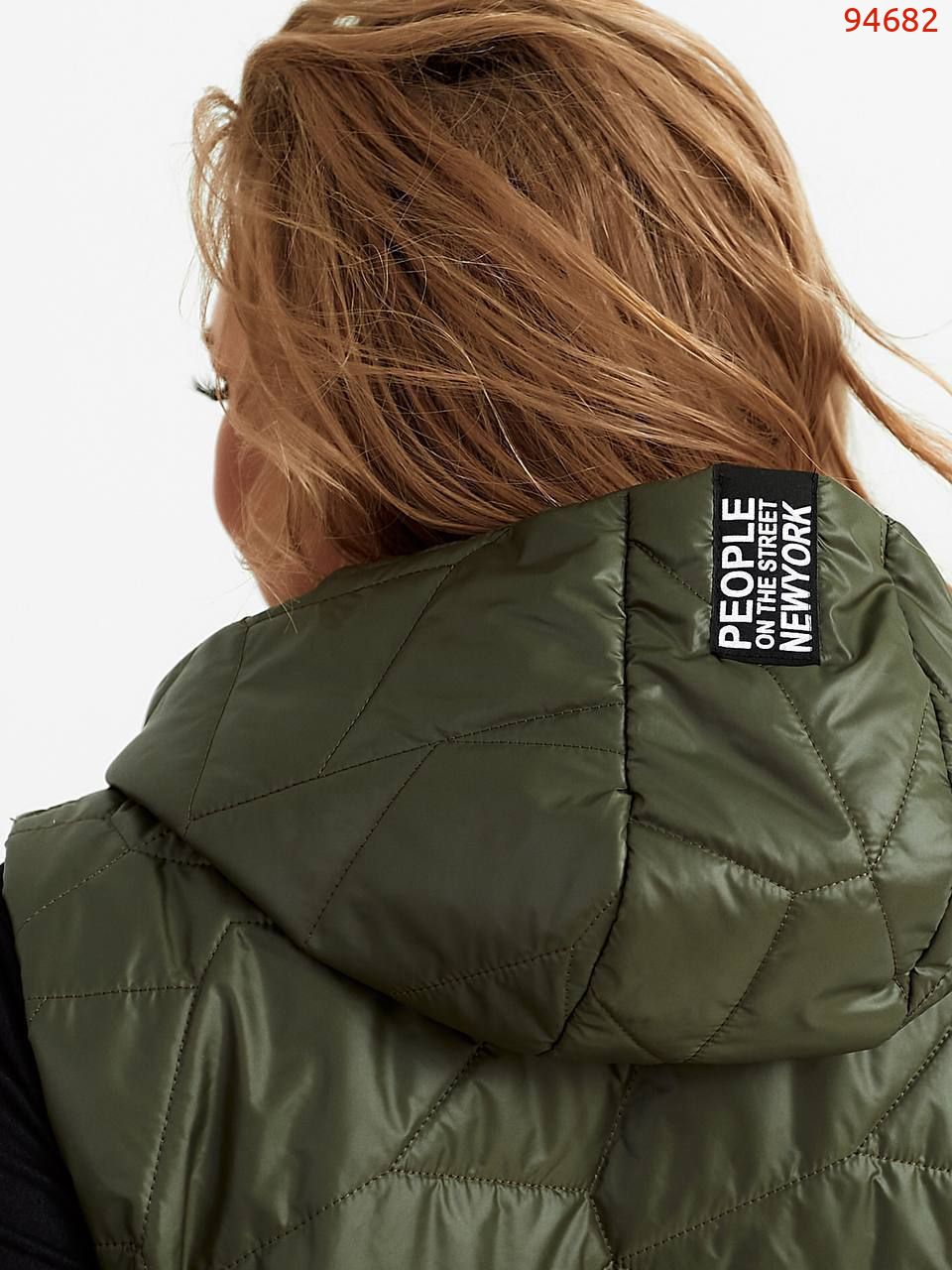 Стильна стегана жилетка прямого крою з накладними кишенями, зручний глибокий капюшон, якісна фурнітура, нашивка