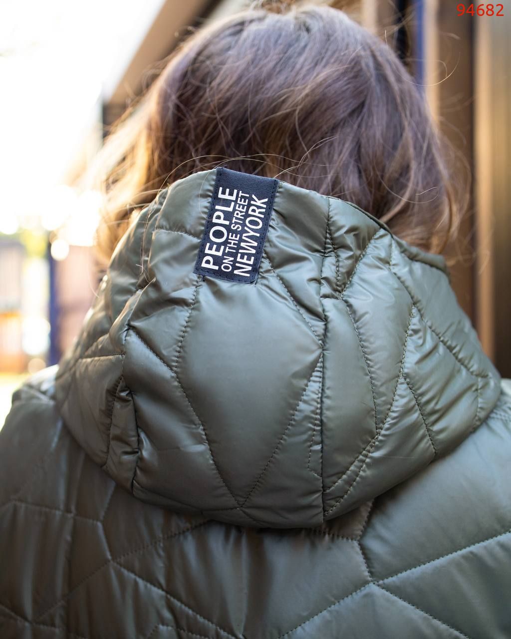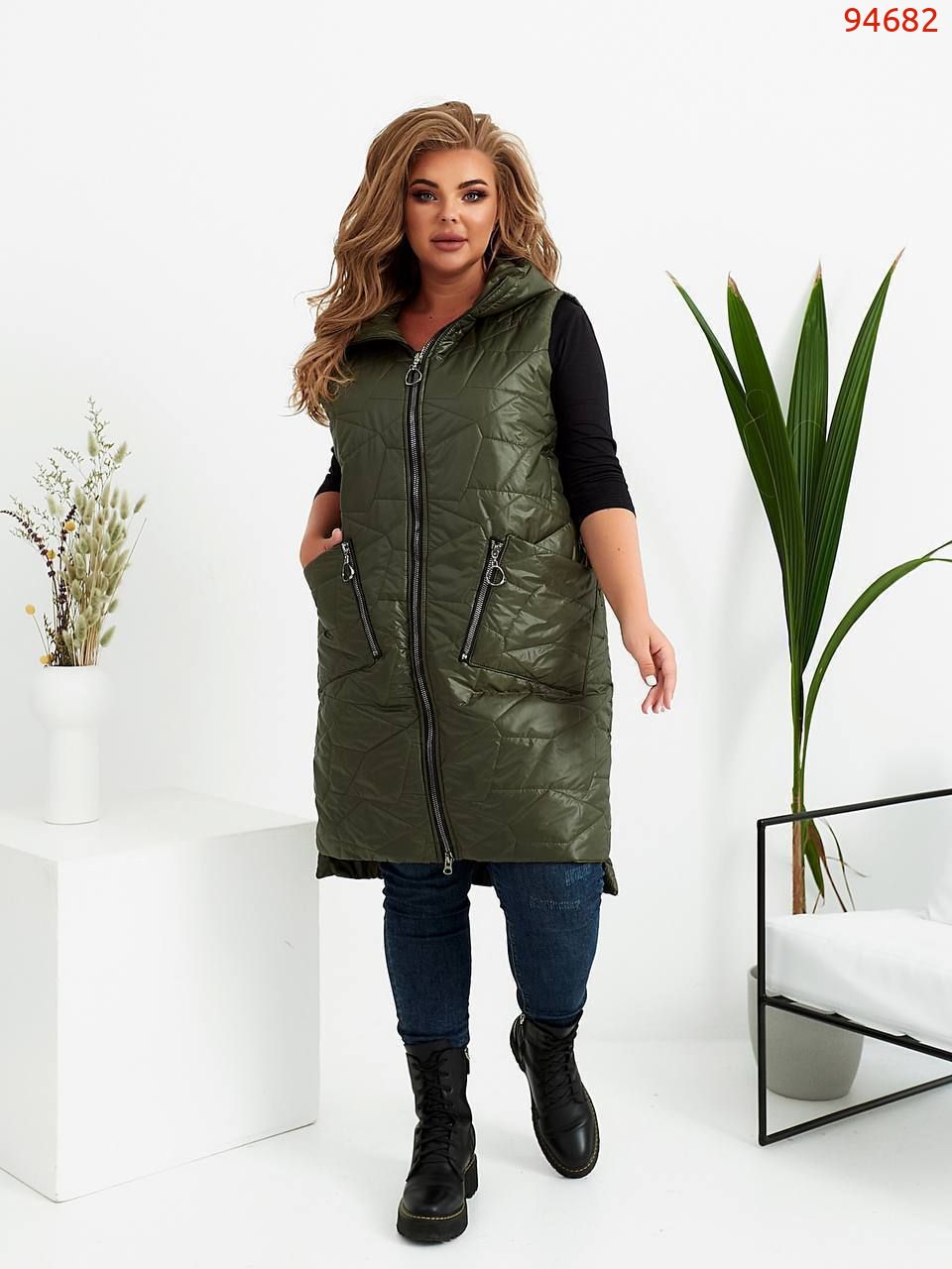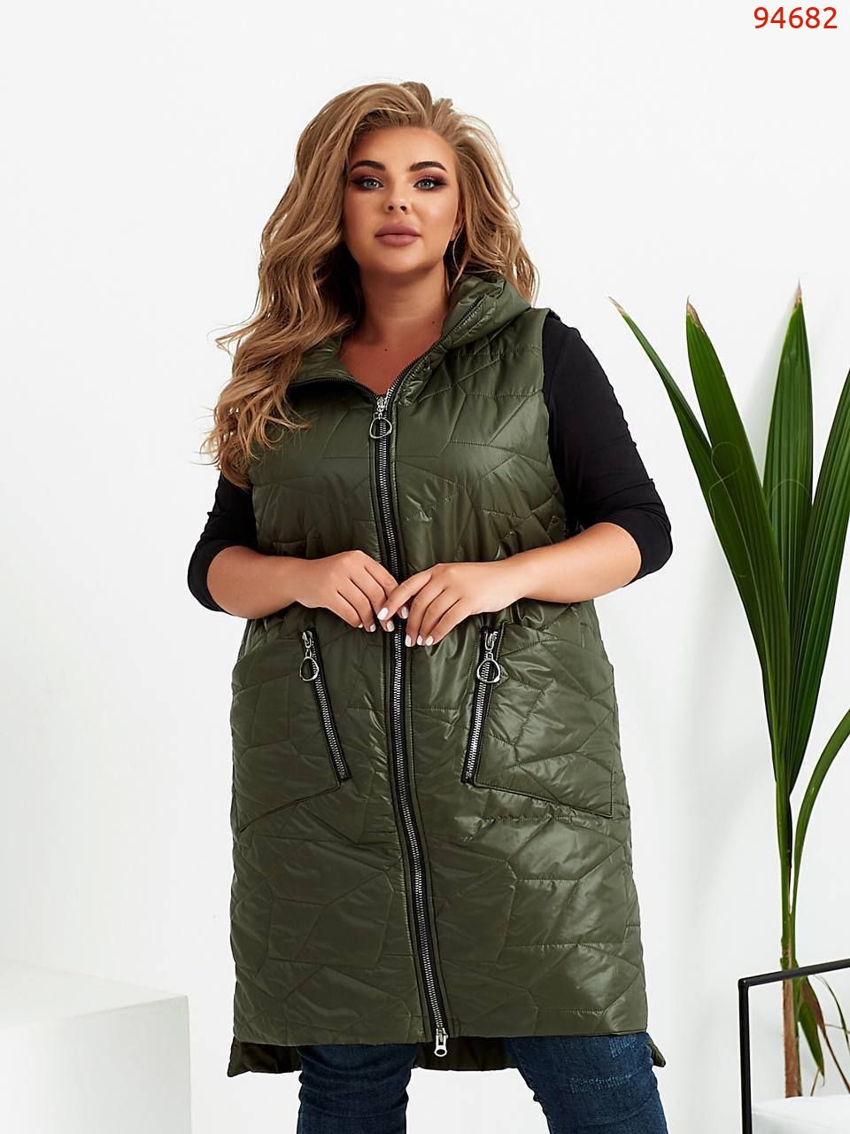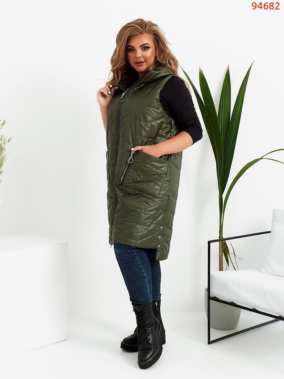 Стильна стегана жилетка прямого крою з накладними кишенями, зручний глибокий капюшон, якісна фурнітура, нашивка
