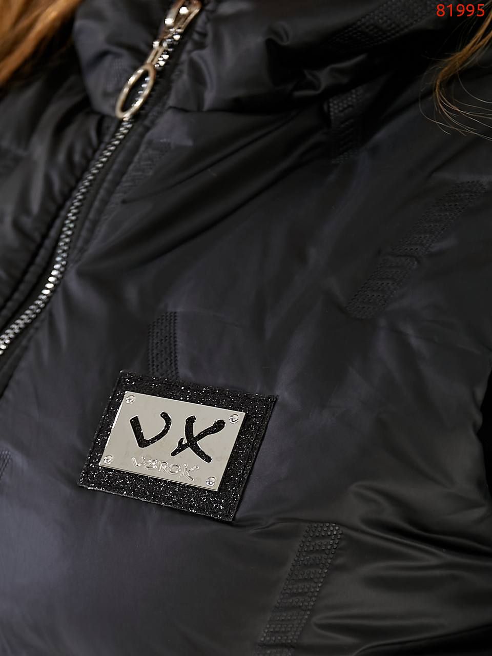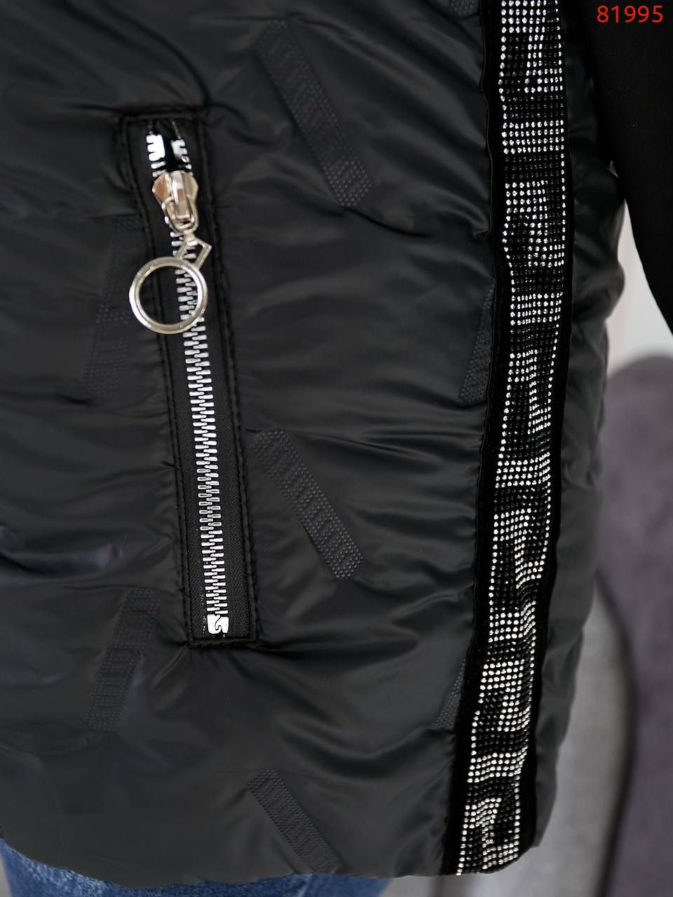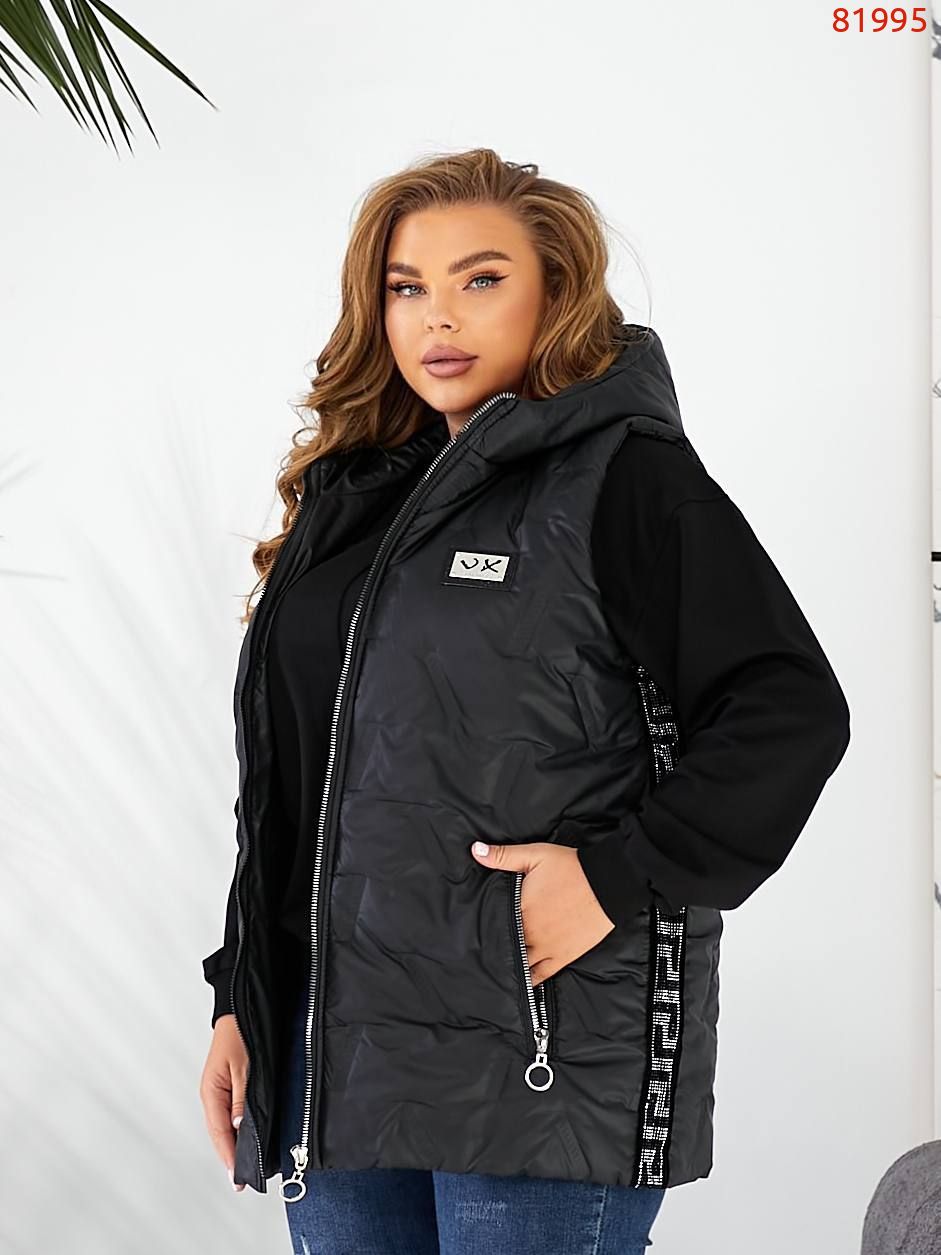 Стильна жилетка прямого крою з кишенями на змійці, зручний глибокий капюшон, декорована лампасами з камінням, якісна фурнітура.