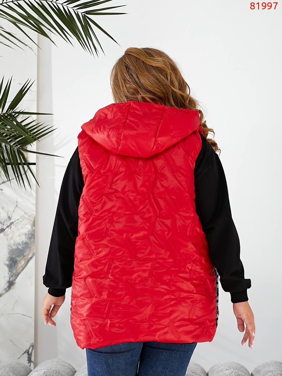 Стильна жилетка прямого крою з кишенями на змійці, зручний глибокий капюшон, декорована лампасами з камінням, якісна фурнітура.